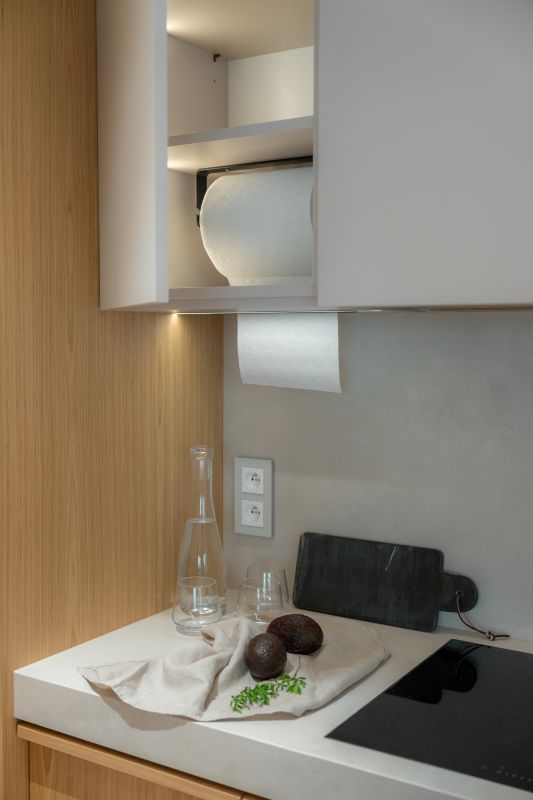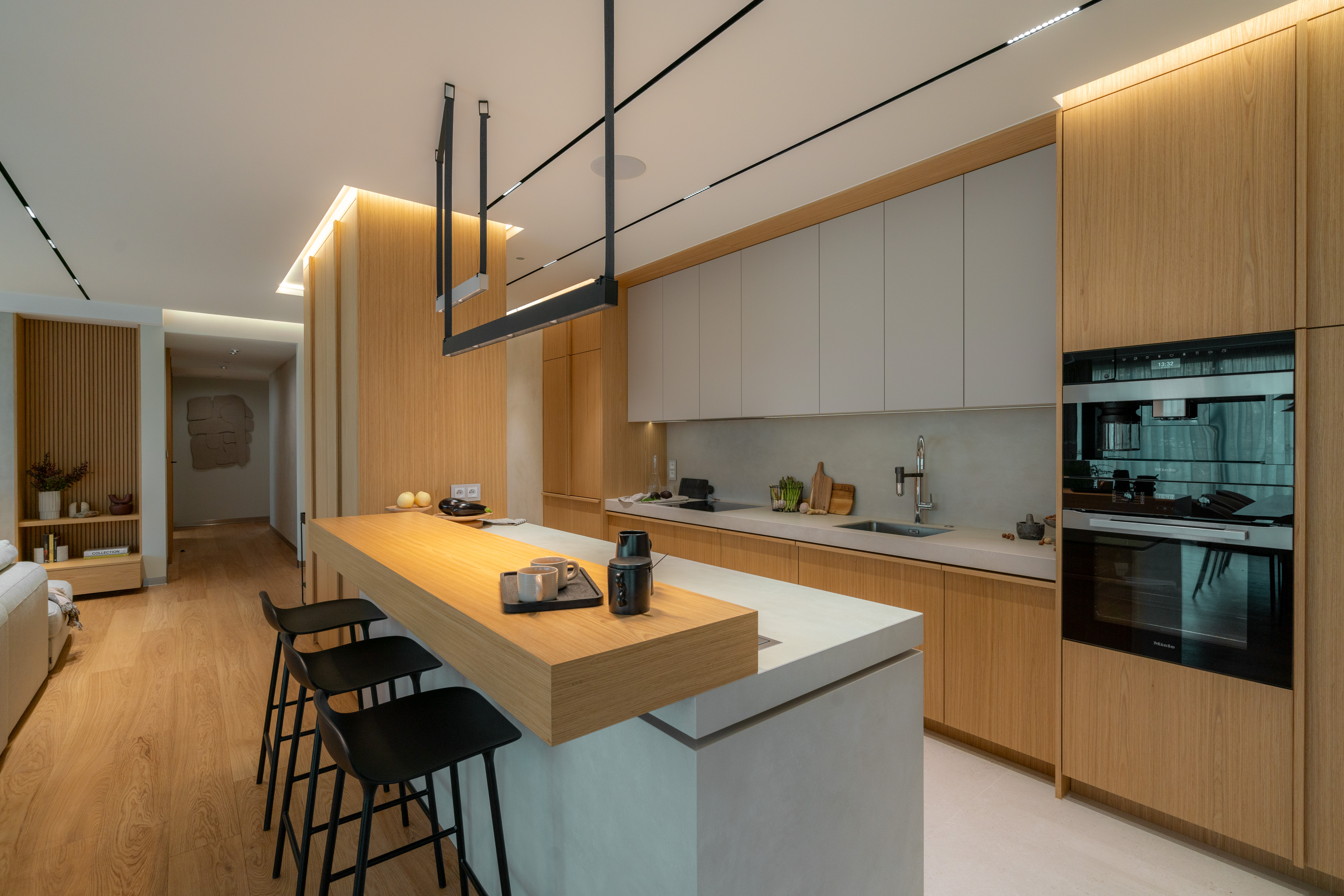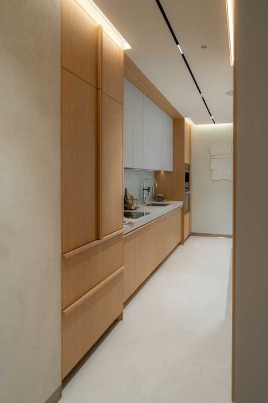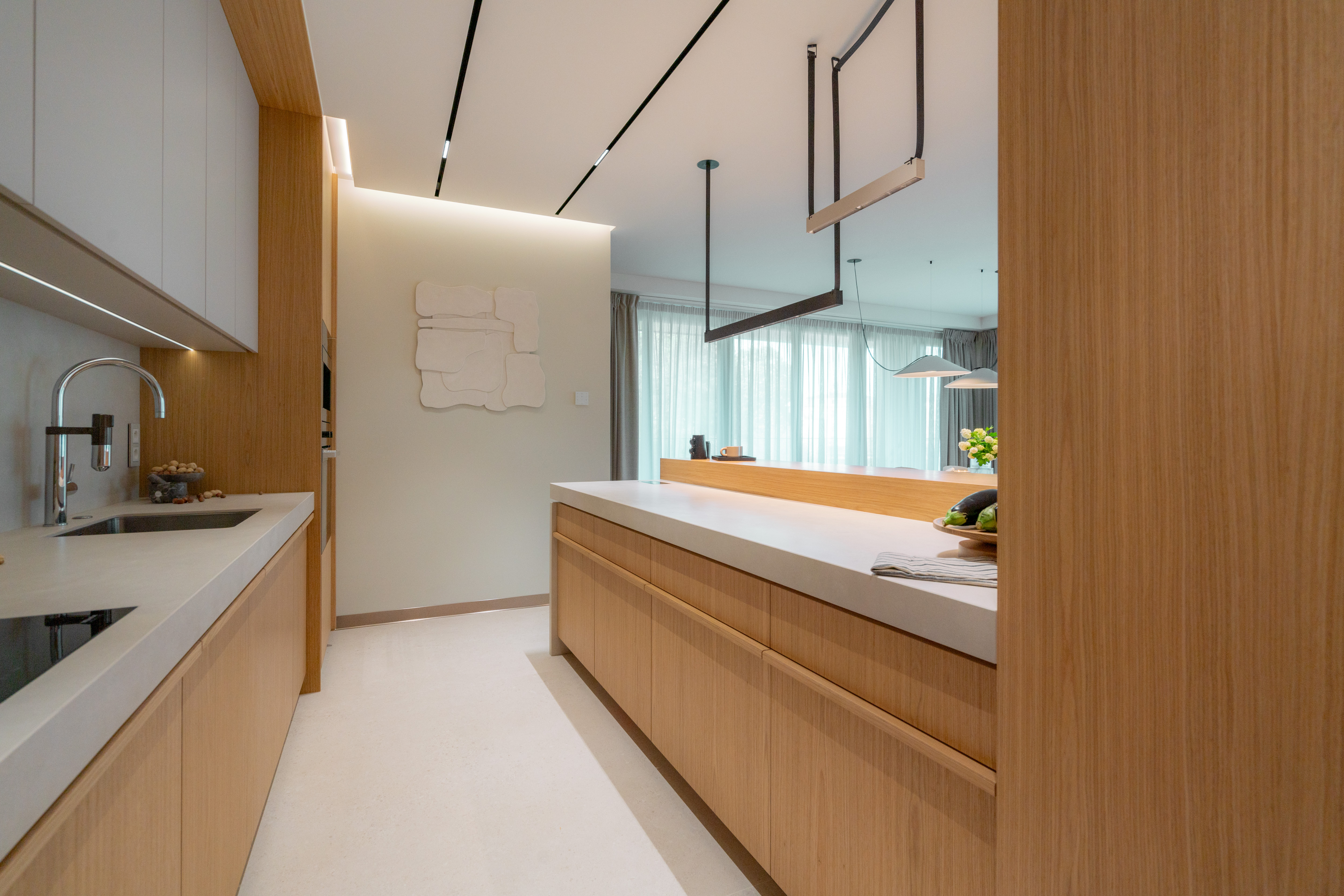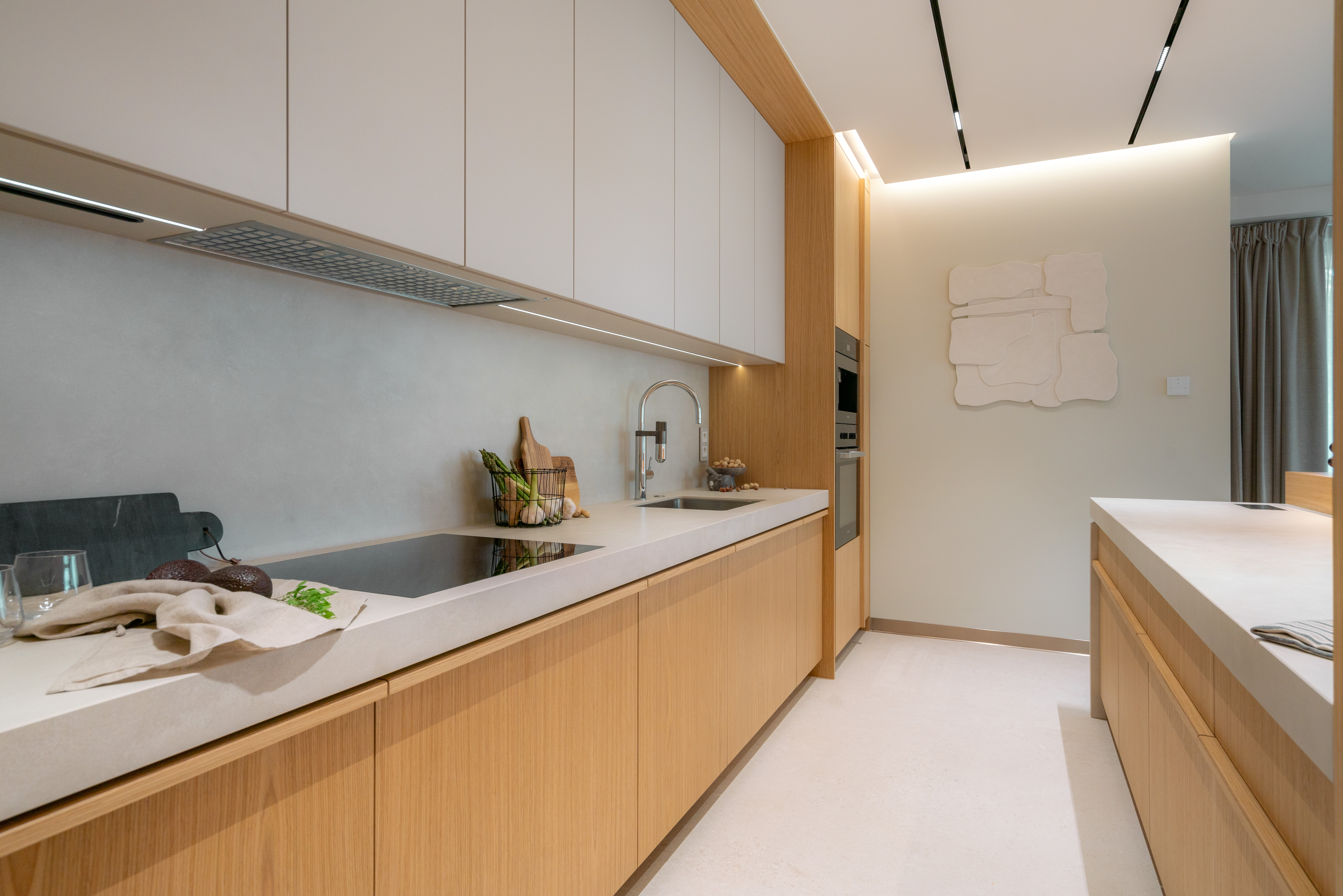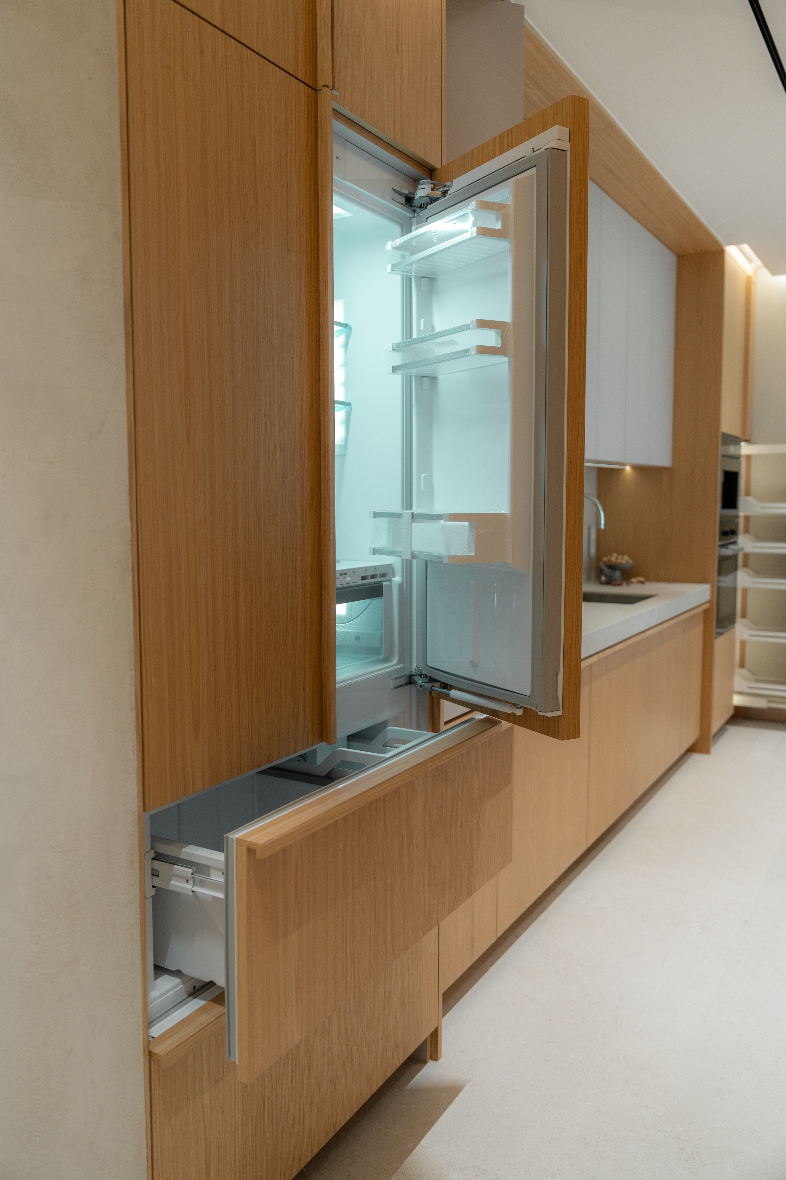 Całość dopełnia system otwierania bezuchwytowego, który wzmacnia minimalistyczny charakter wnętrza i zapewnia jednolitą linię mebli. Przemyślana ergonomia — odpowiednie wysokości robocze, ukryte schowki i logiczny podział stref — sprawia, że projekt łączy estetykę z funkcjonalnością. Wykonanie z materiałów premium i dbałość o detale gwarantują trwałość i elegancki wygląd na lata.
