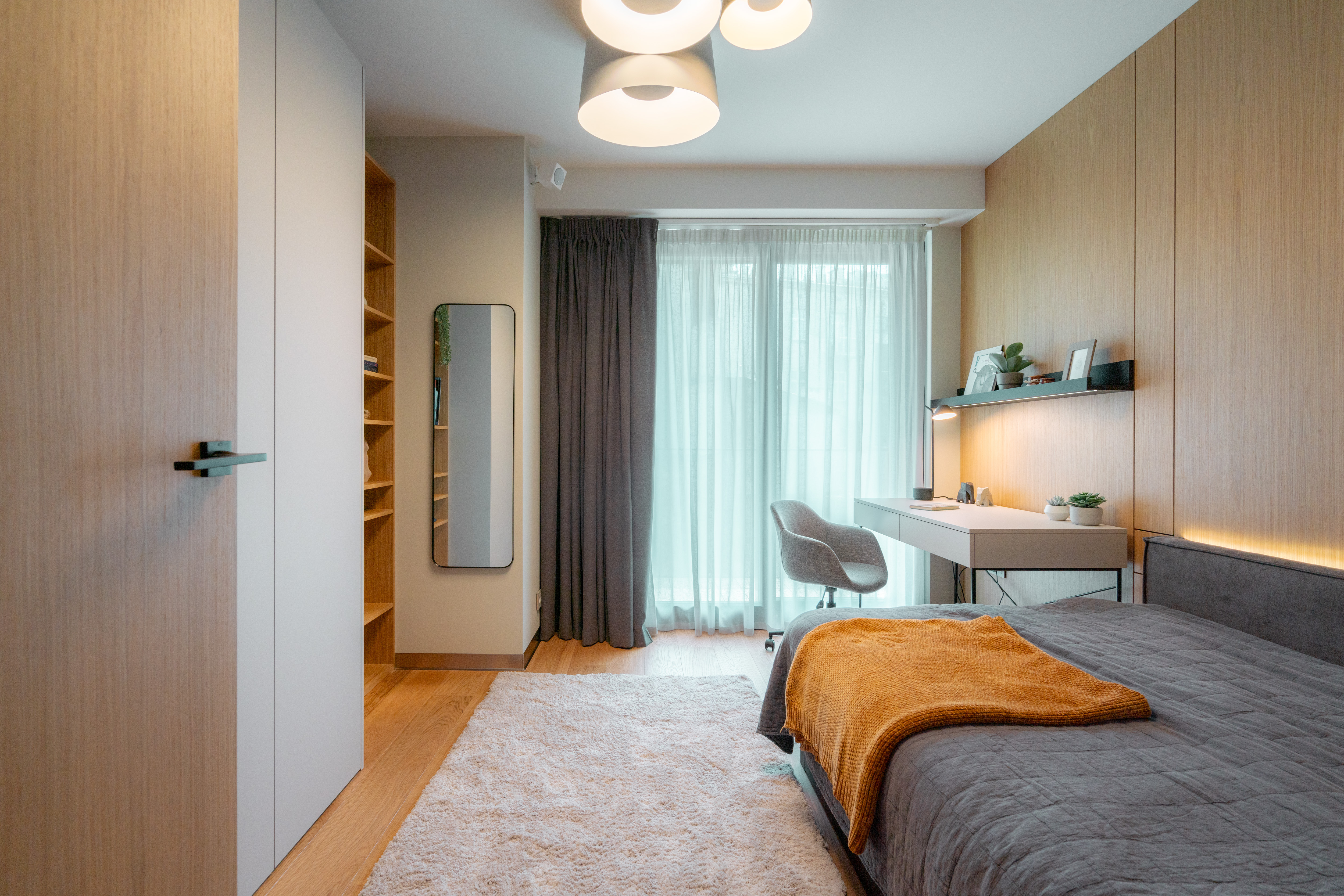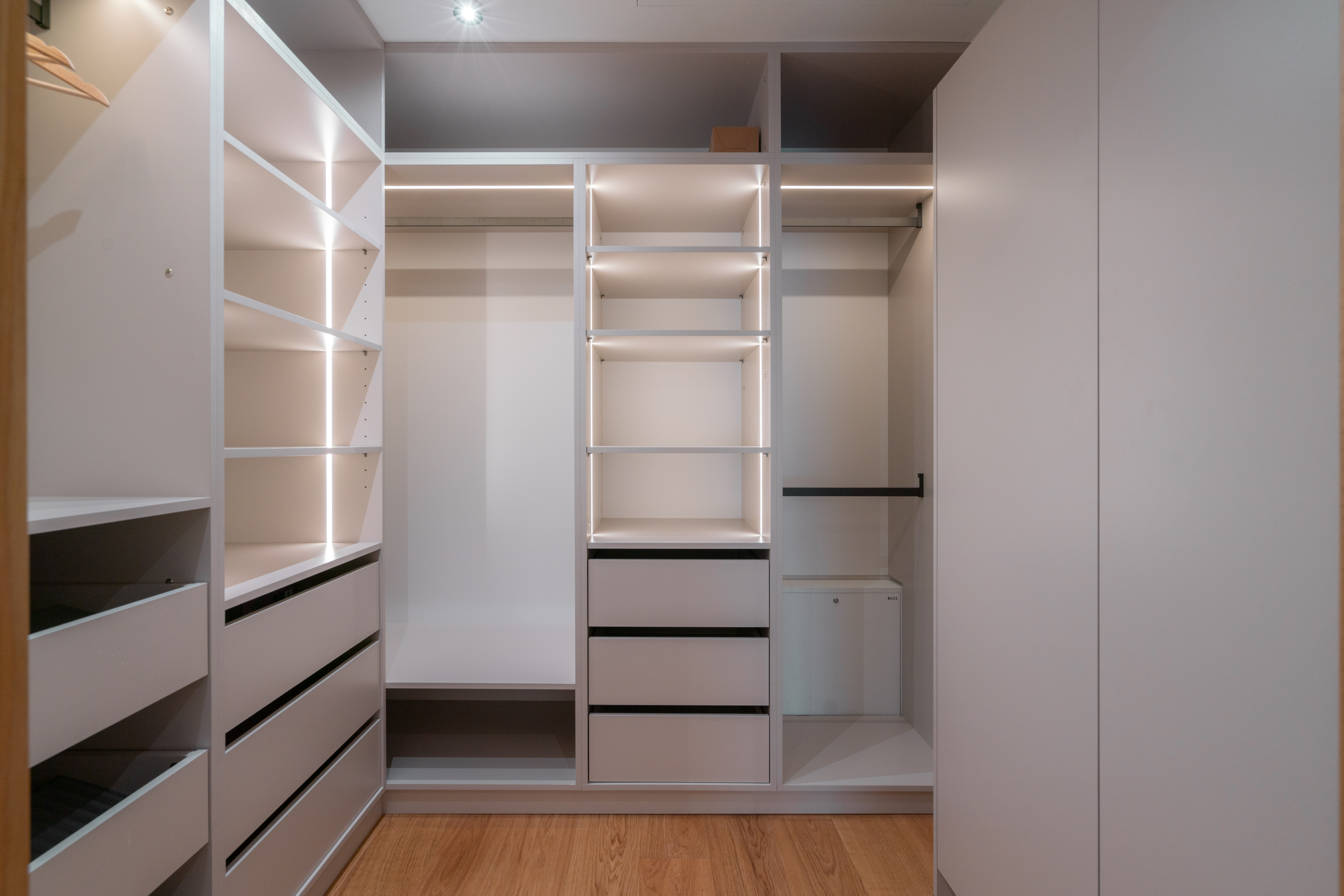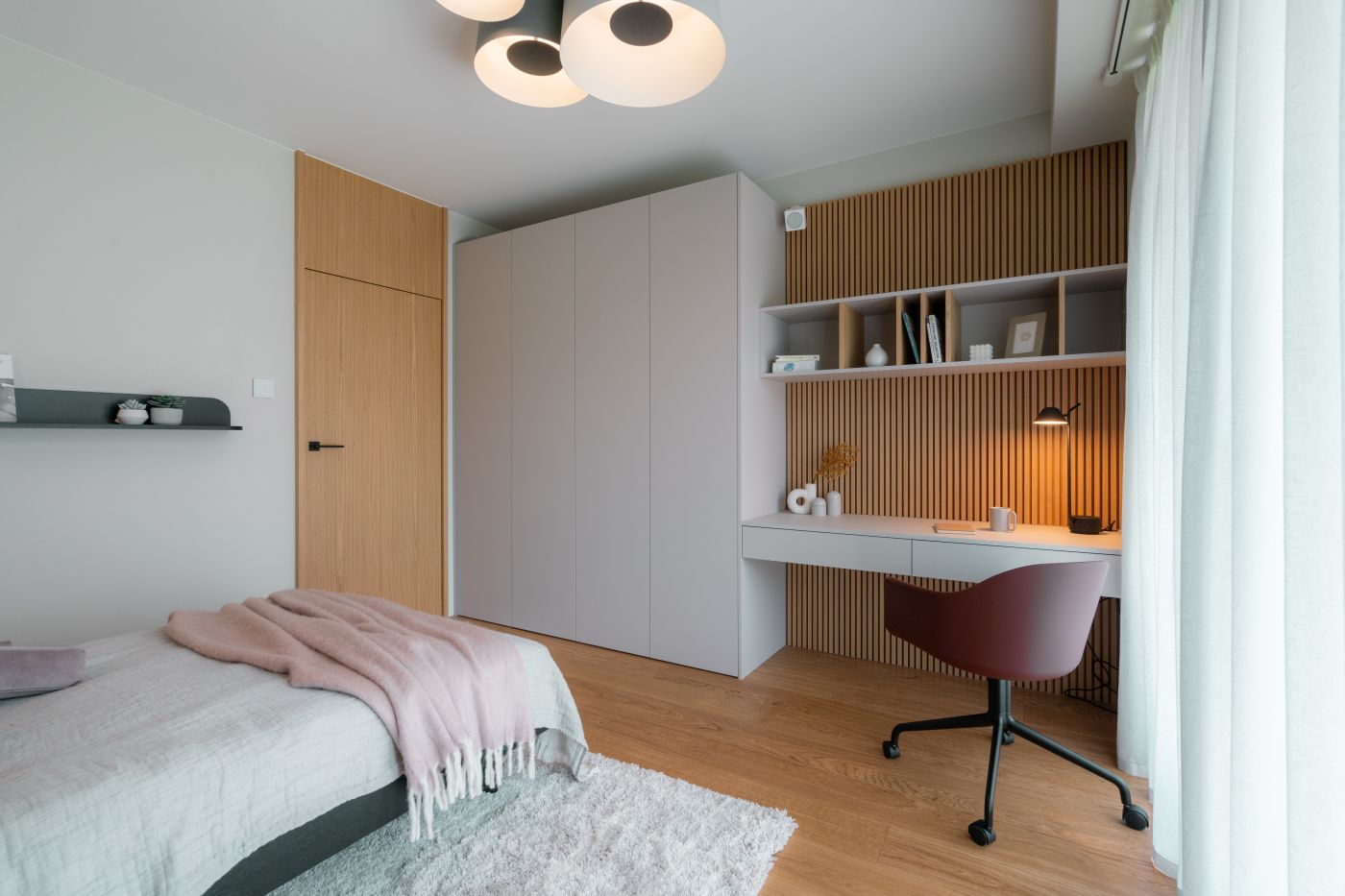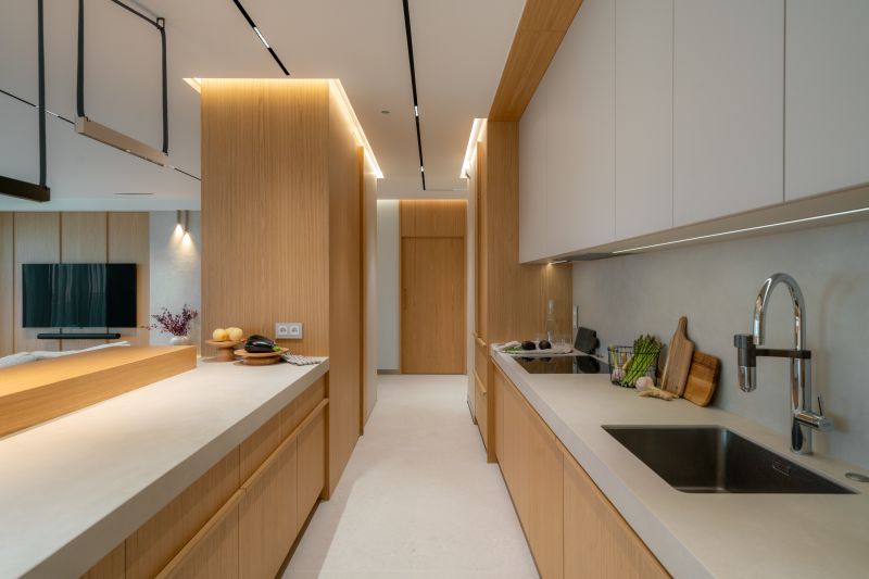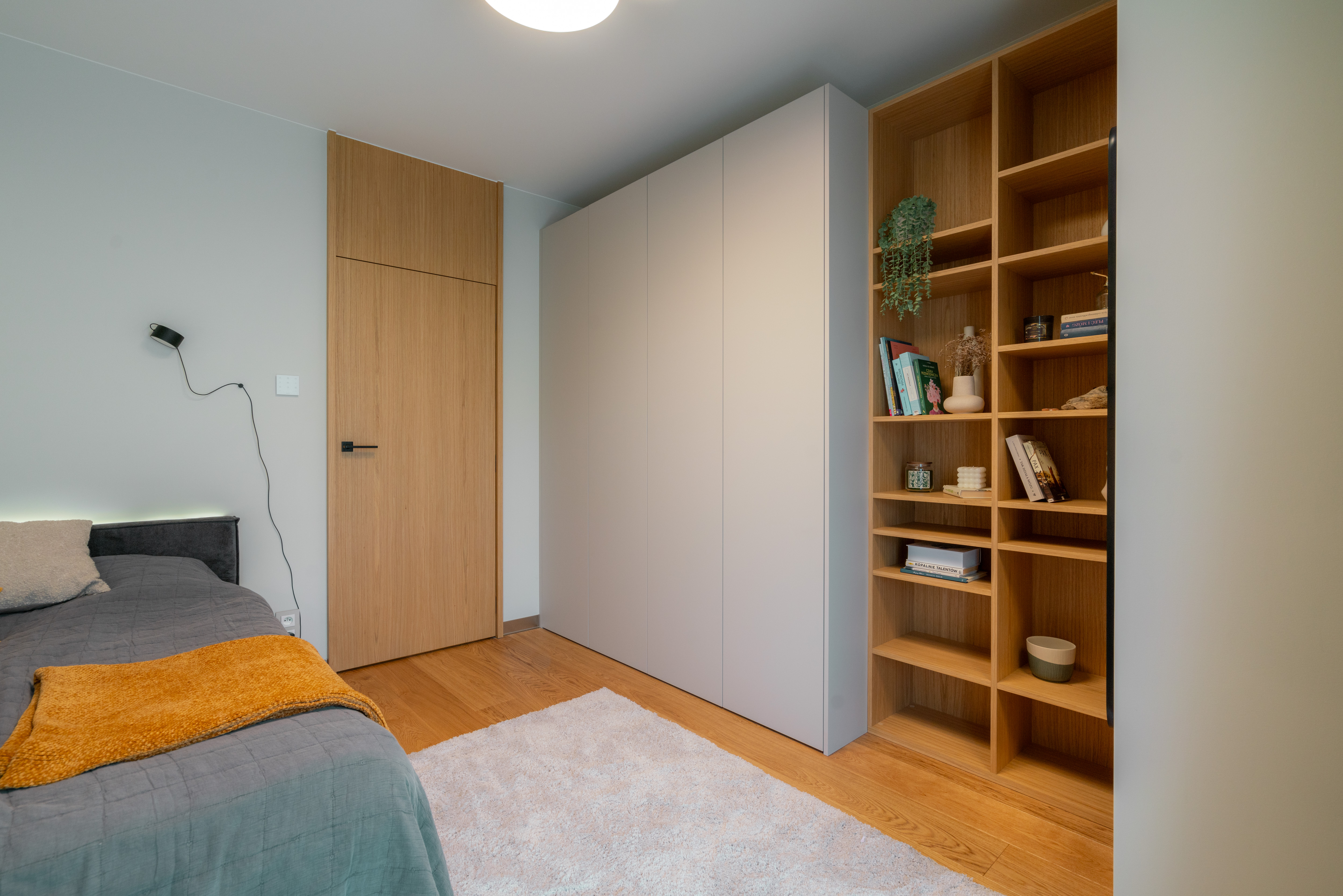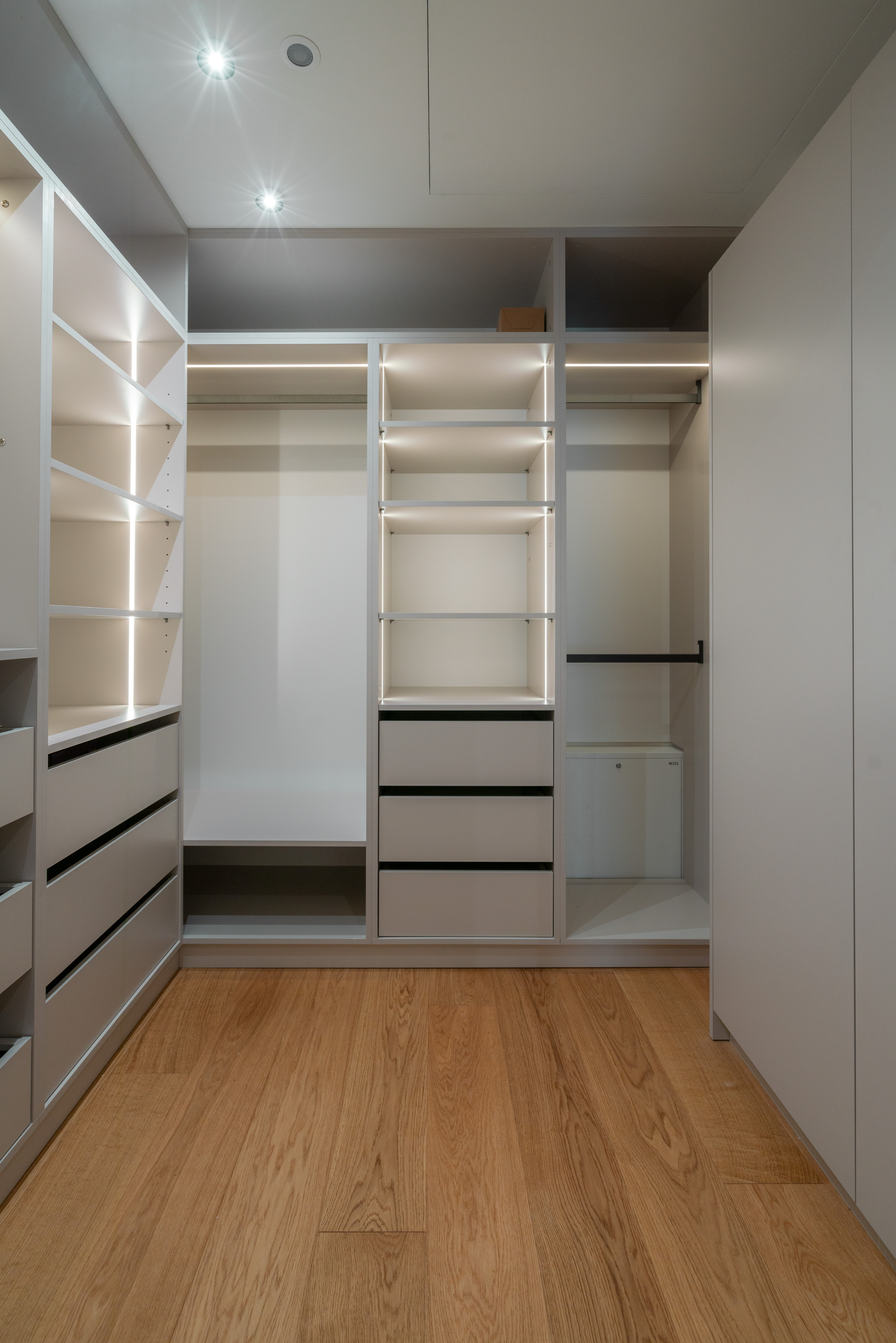 Całość dopełnia system otwierania bezuchwytowego, który wzmacnia minimalistyczny charakter wnętrza i zapewnia jednolitą linię mebli. Przemyślana ergonomia — odpowiednie wysokości robocze, ukryte schowki i logiczny podział stref — sprawia, że projekt łączy estetykę z funkcjonalnością. Wykonanie z materiałów premium i dbałość o detale gwarantują trwałość i elegancki wygląd na lata.