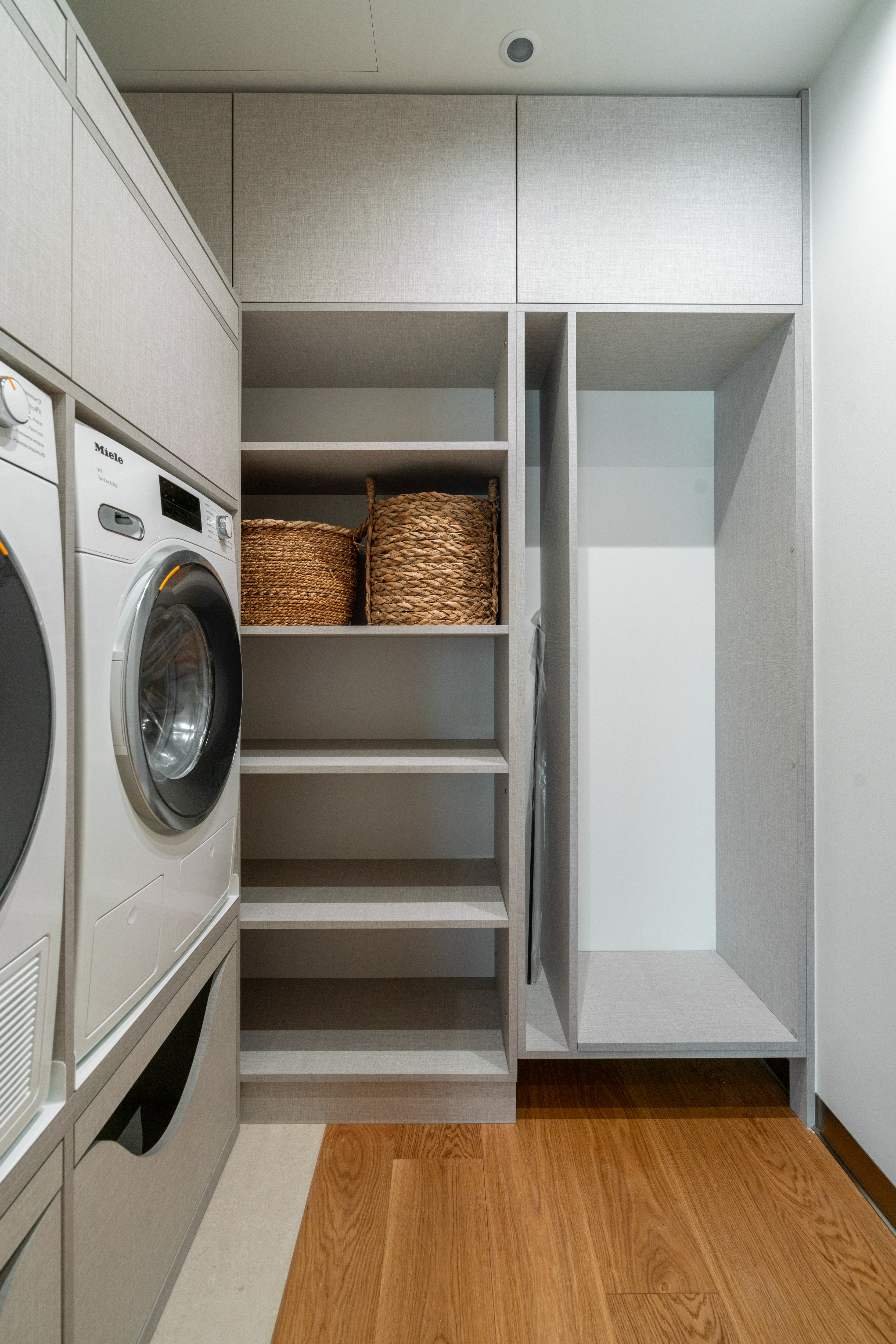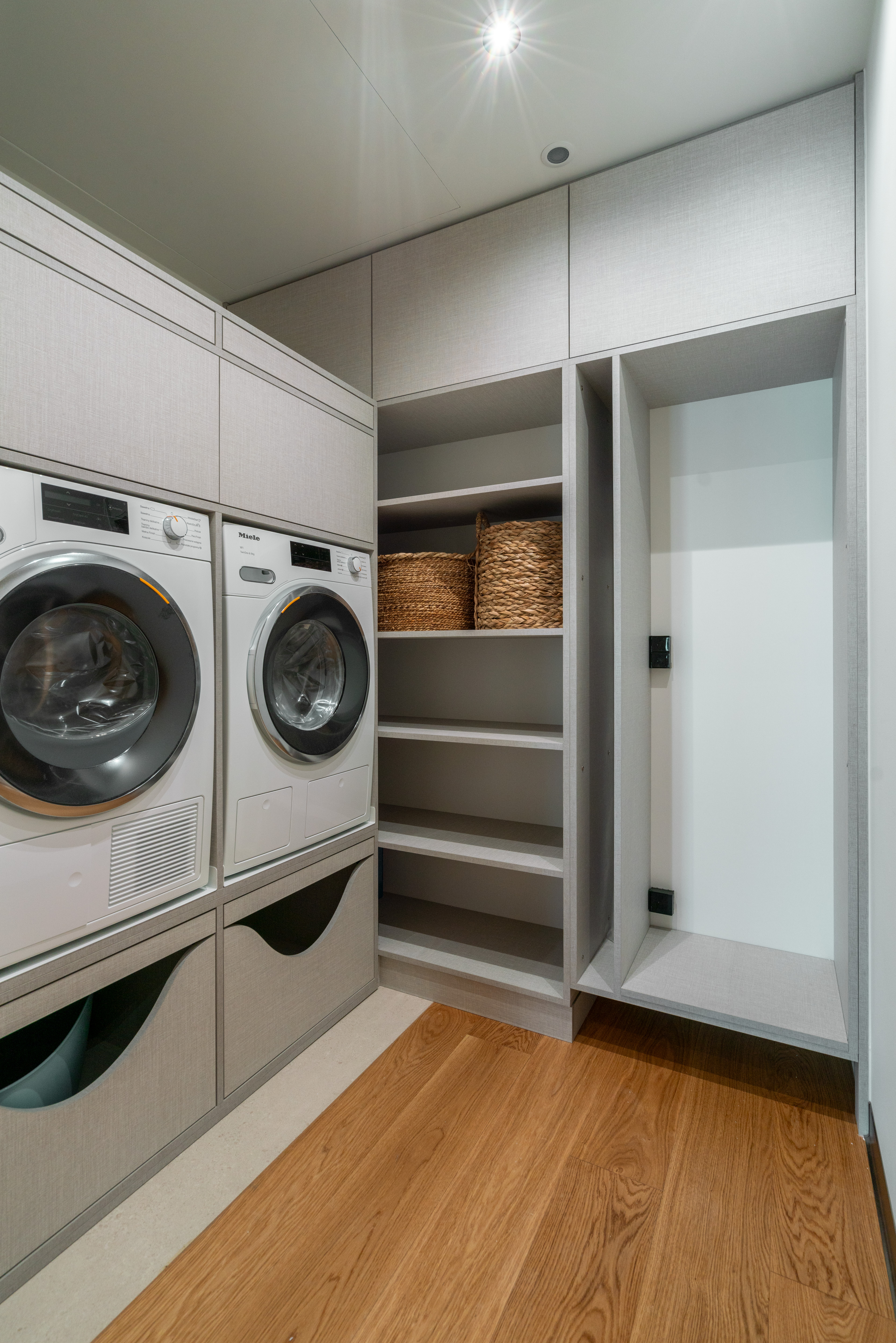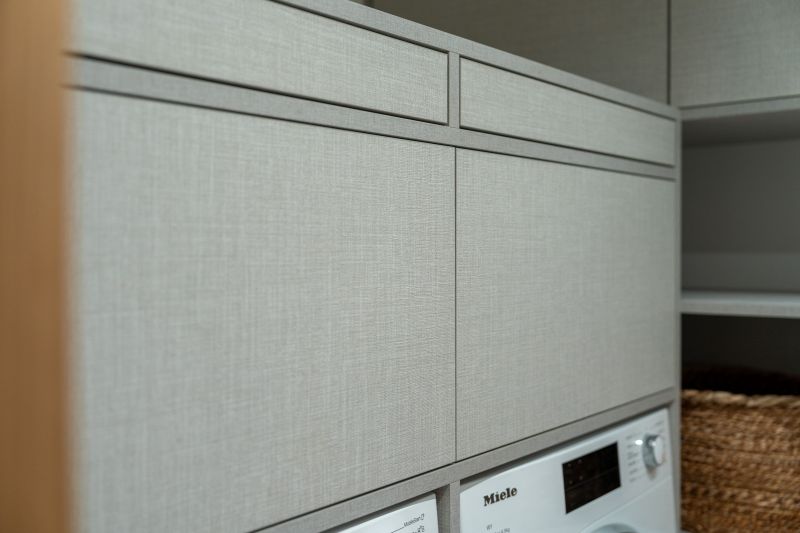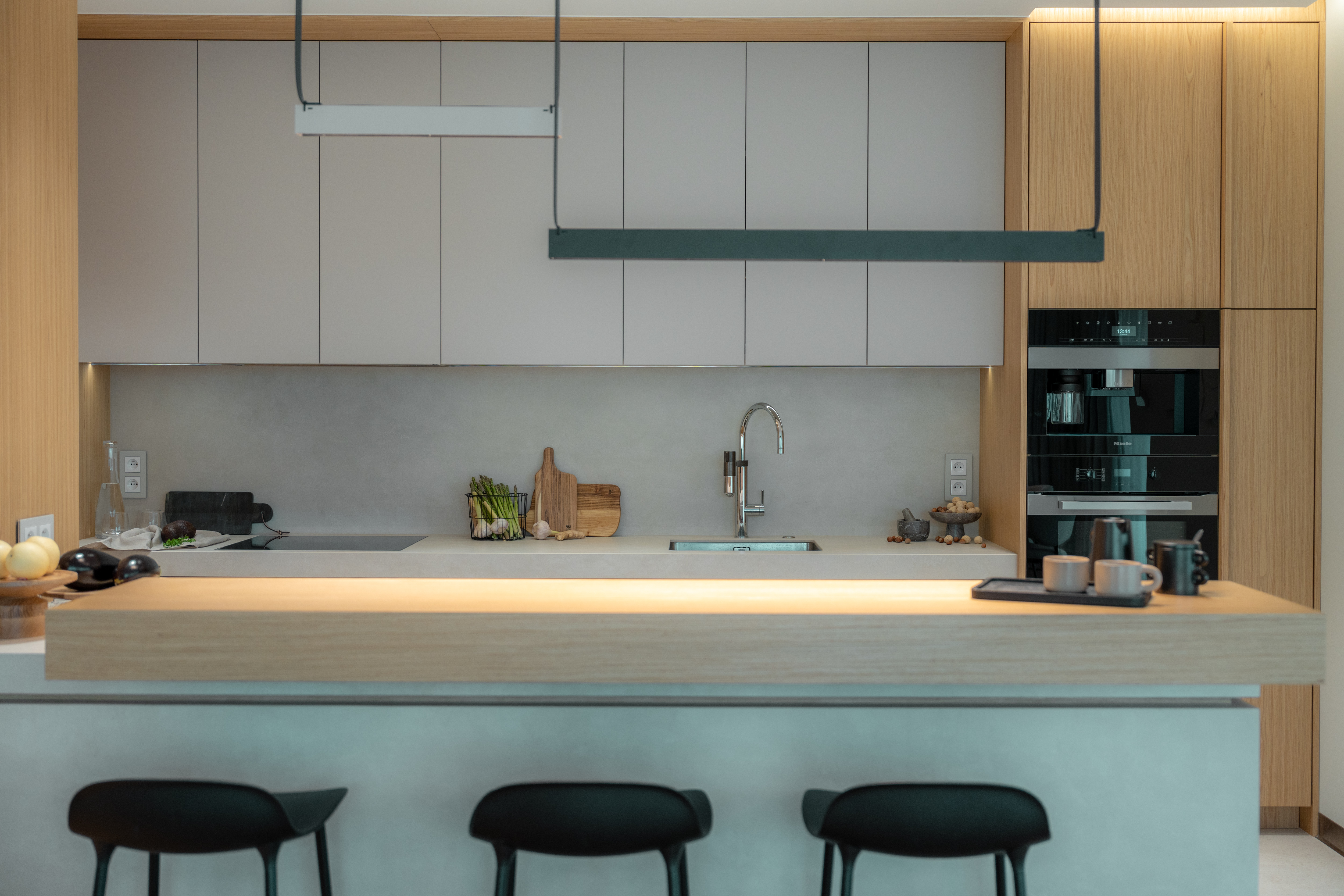 Kuchnia zaprojektowana została z myślą o trwałości i elegancji — blaty kamienne nadają przestrzeni wyrazu i są odporne na intensywne użytkowanie. W wybranych miejscach zastosowano płyty meblowe Forner z powłoką anti-fingerprint w stonowanych odcieniach szarości, co ułatwia utrzymanie czystości i zachowuje estetykę matowych frontów.