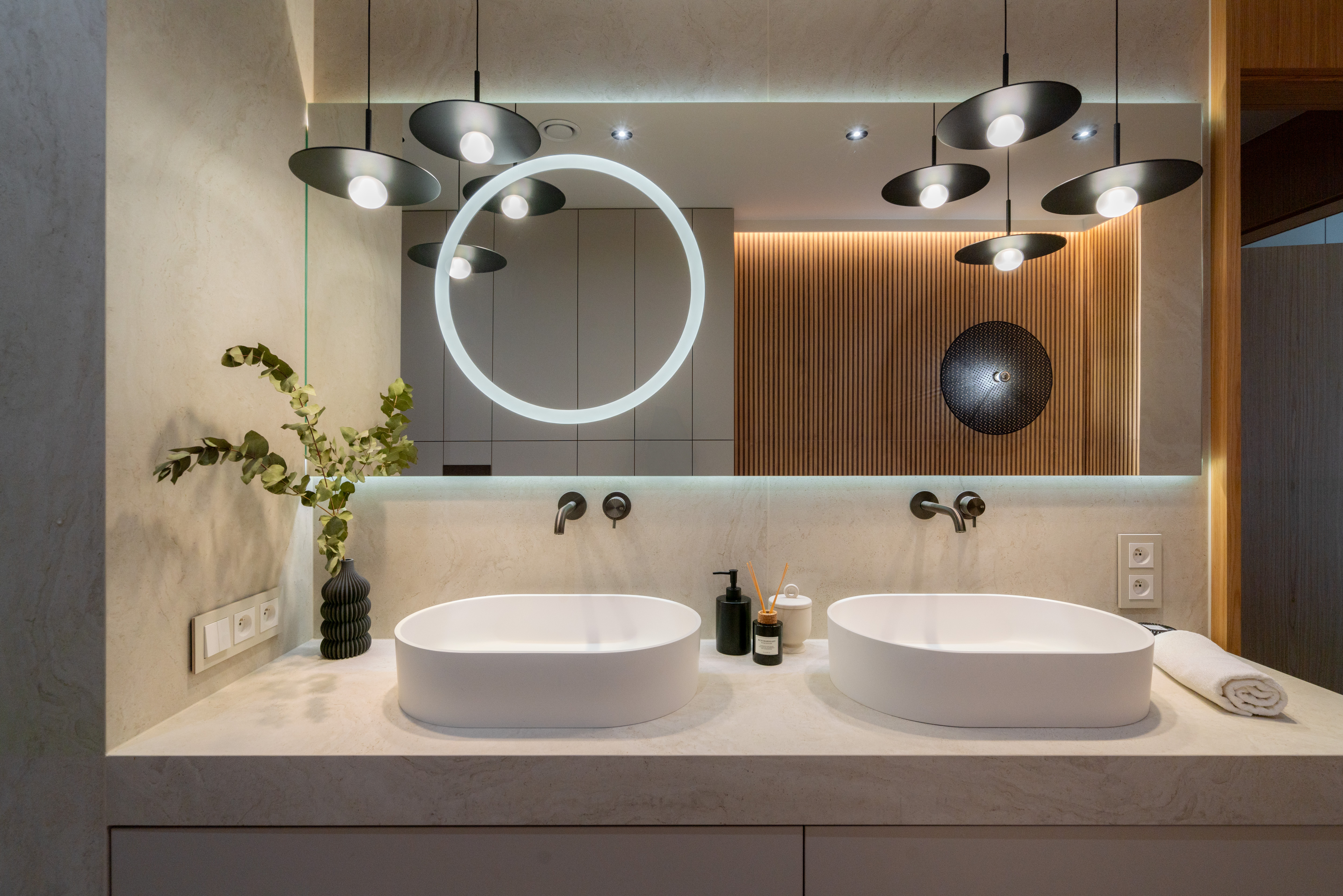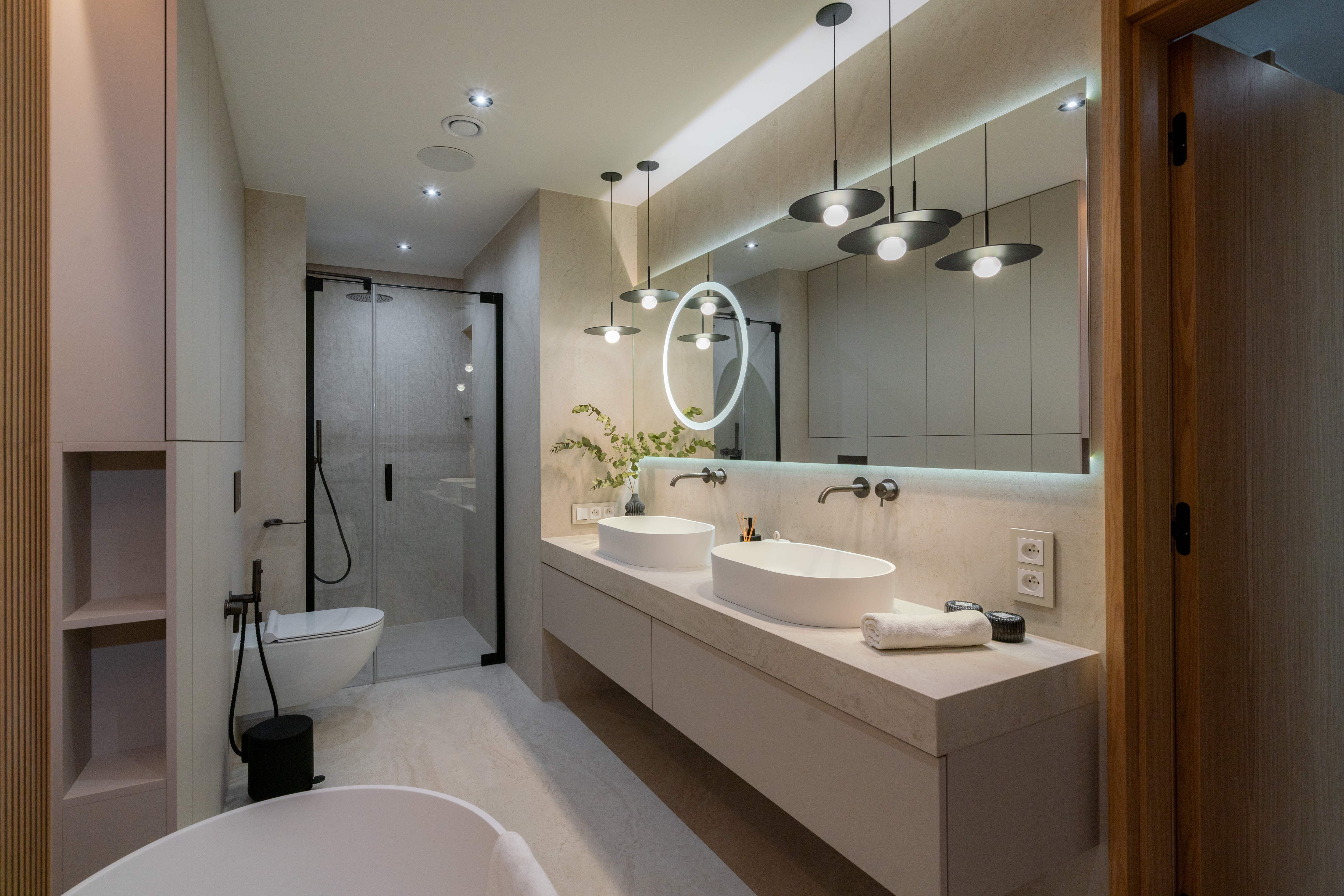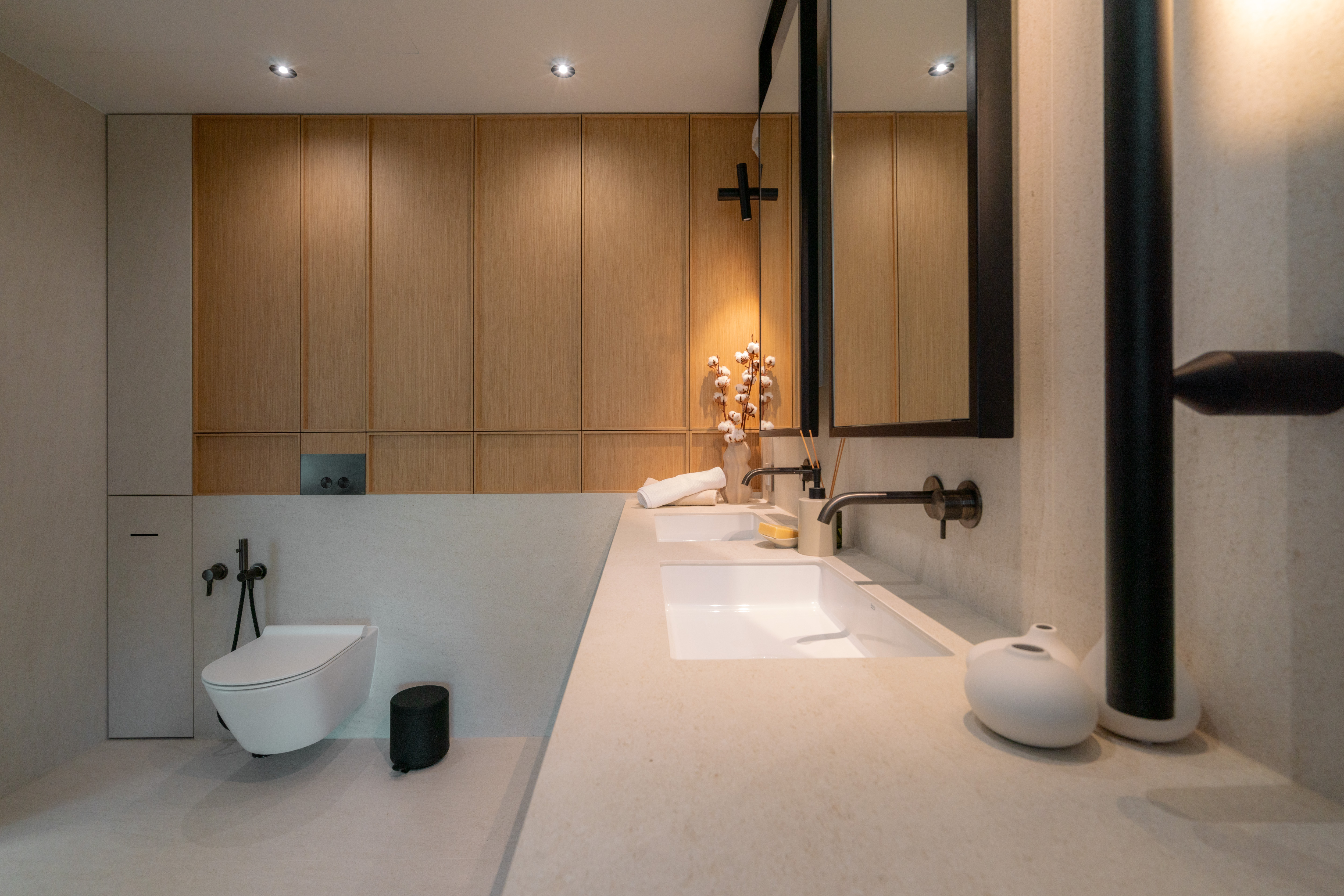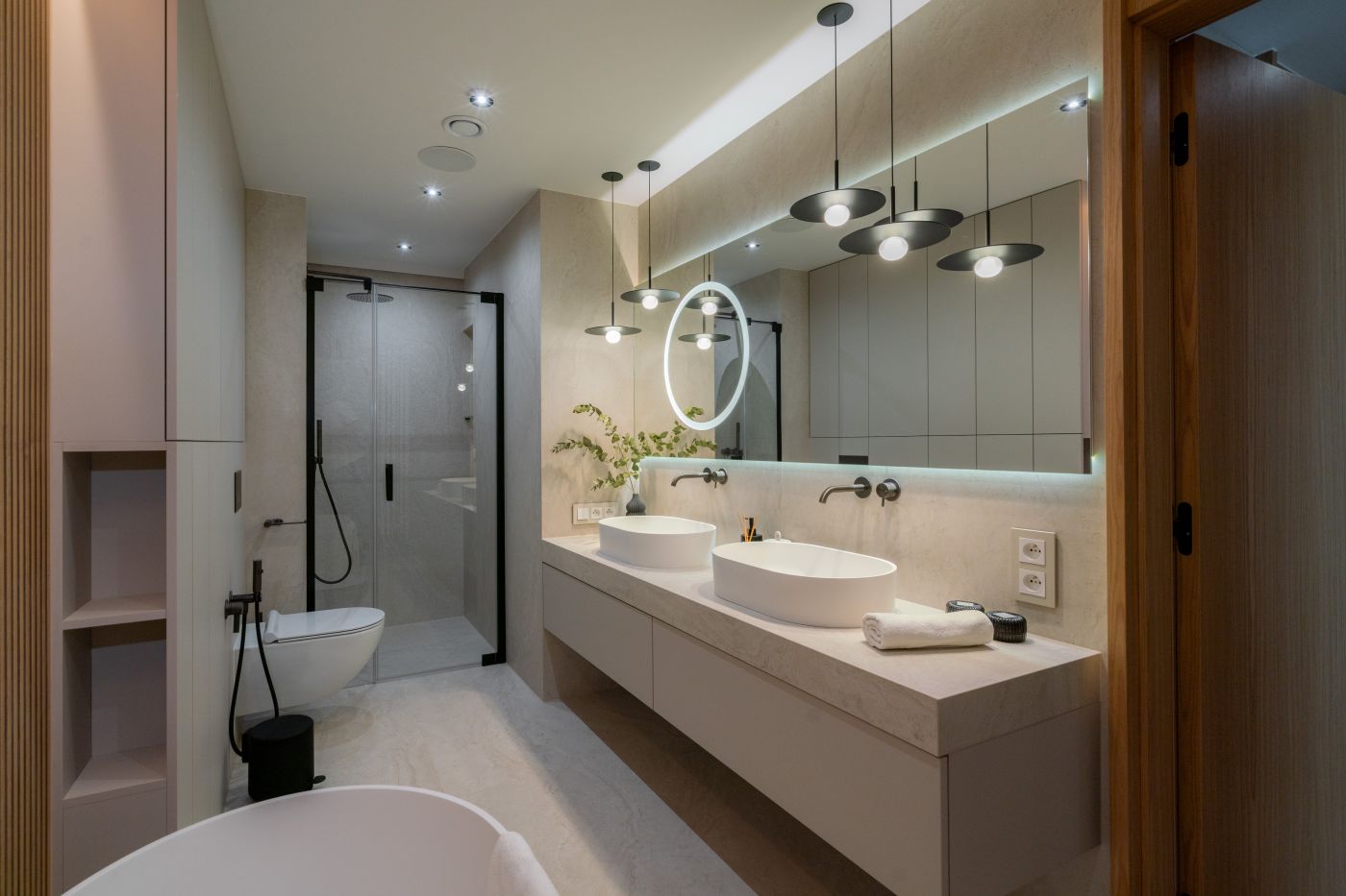 Kuchnia zaprojektowana została z myślą o trwałości i elegancji — blaty kamienne nadają przestrzeni wyrazu i są odporne na intensywne użytkowanie. W wybranych miejscach zastosowano płyty meblowe Forner z powłoką anti-fingerprint w stonowanych odcieniach szarości, co ułatwia utrzymanie czystości i zachowuje estetykę matowych frontów.