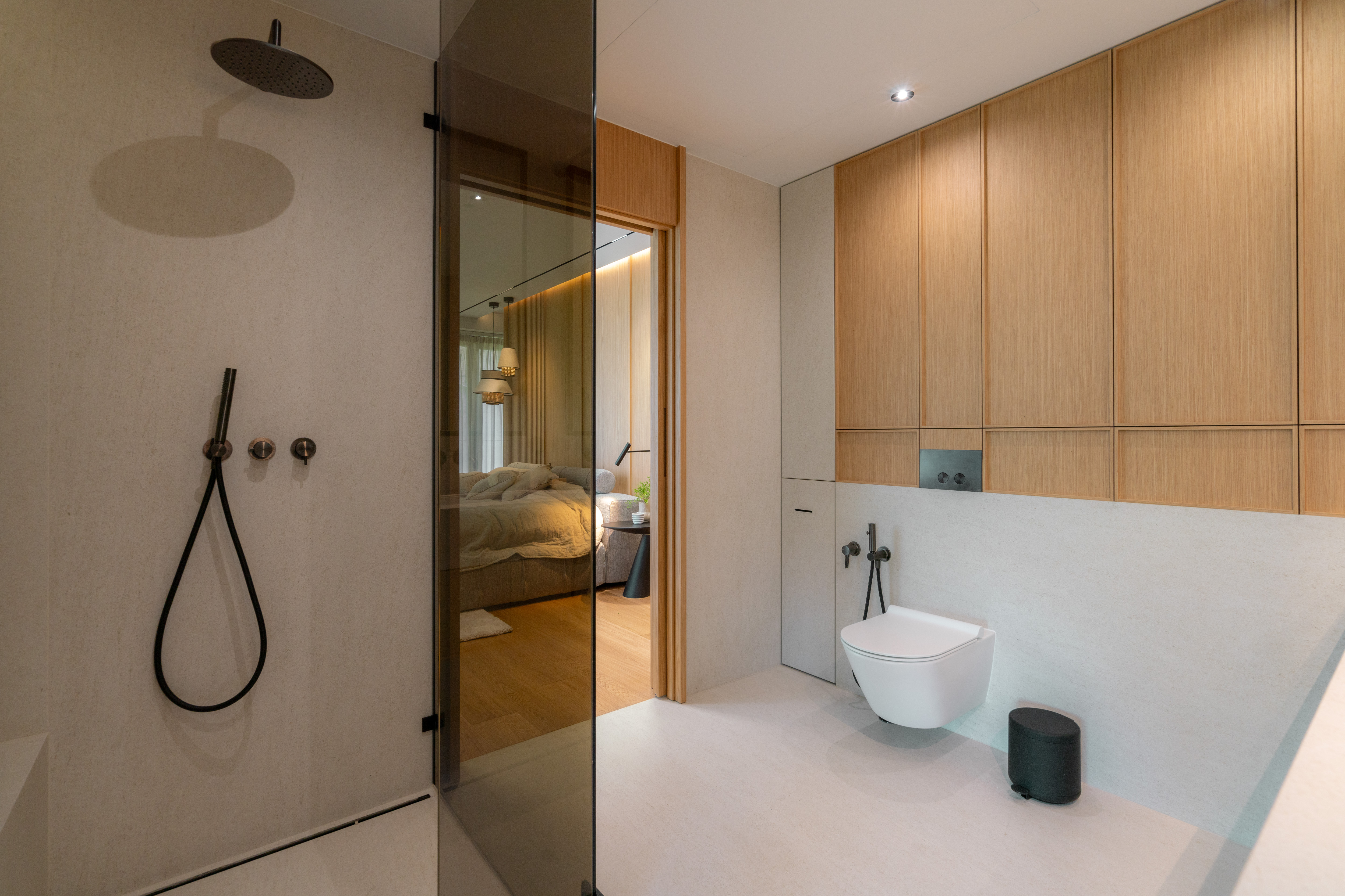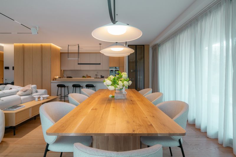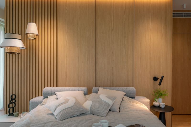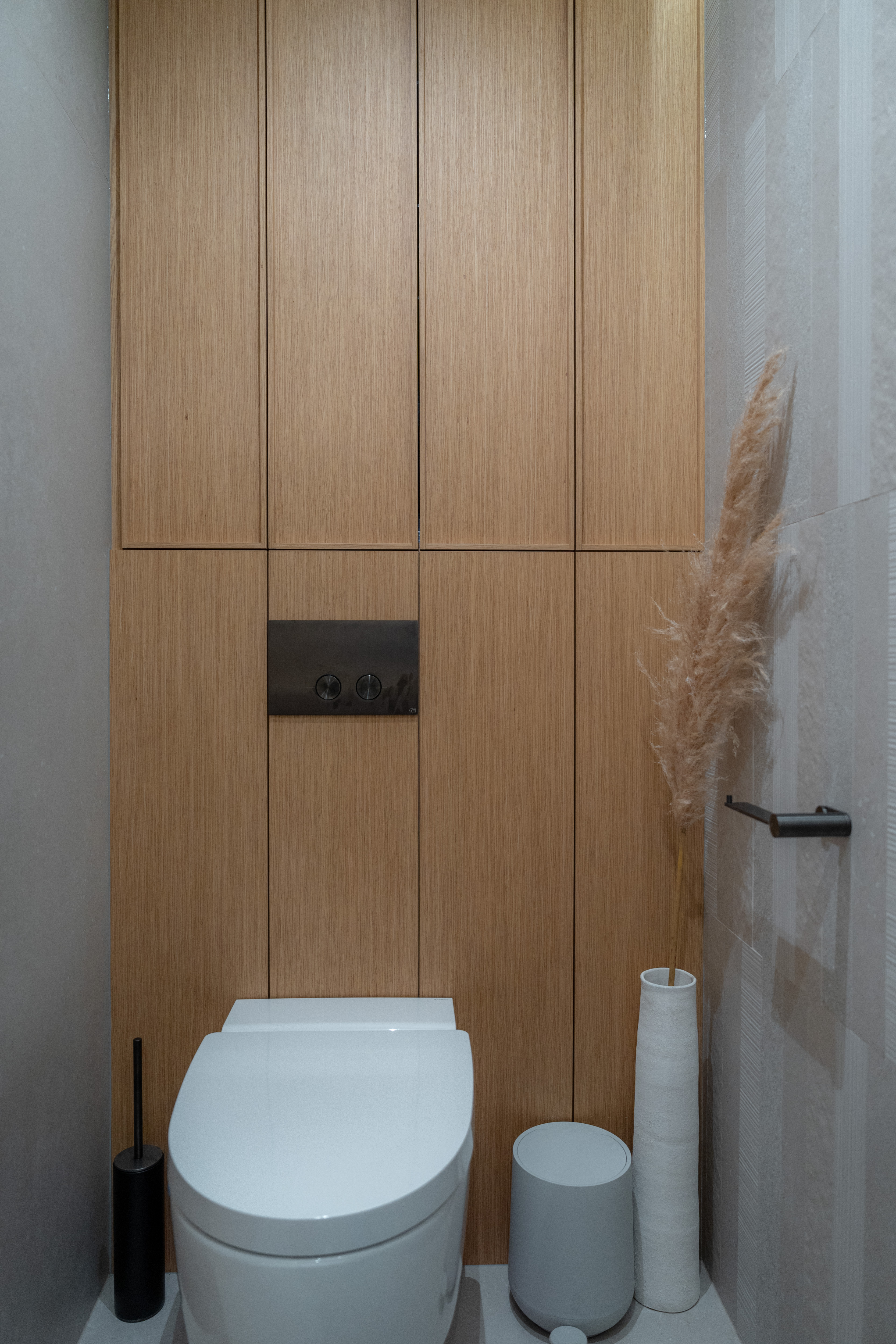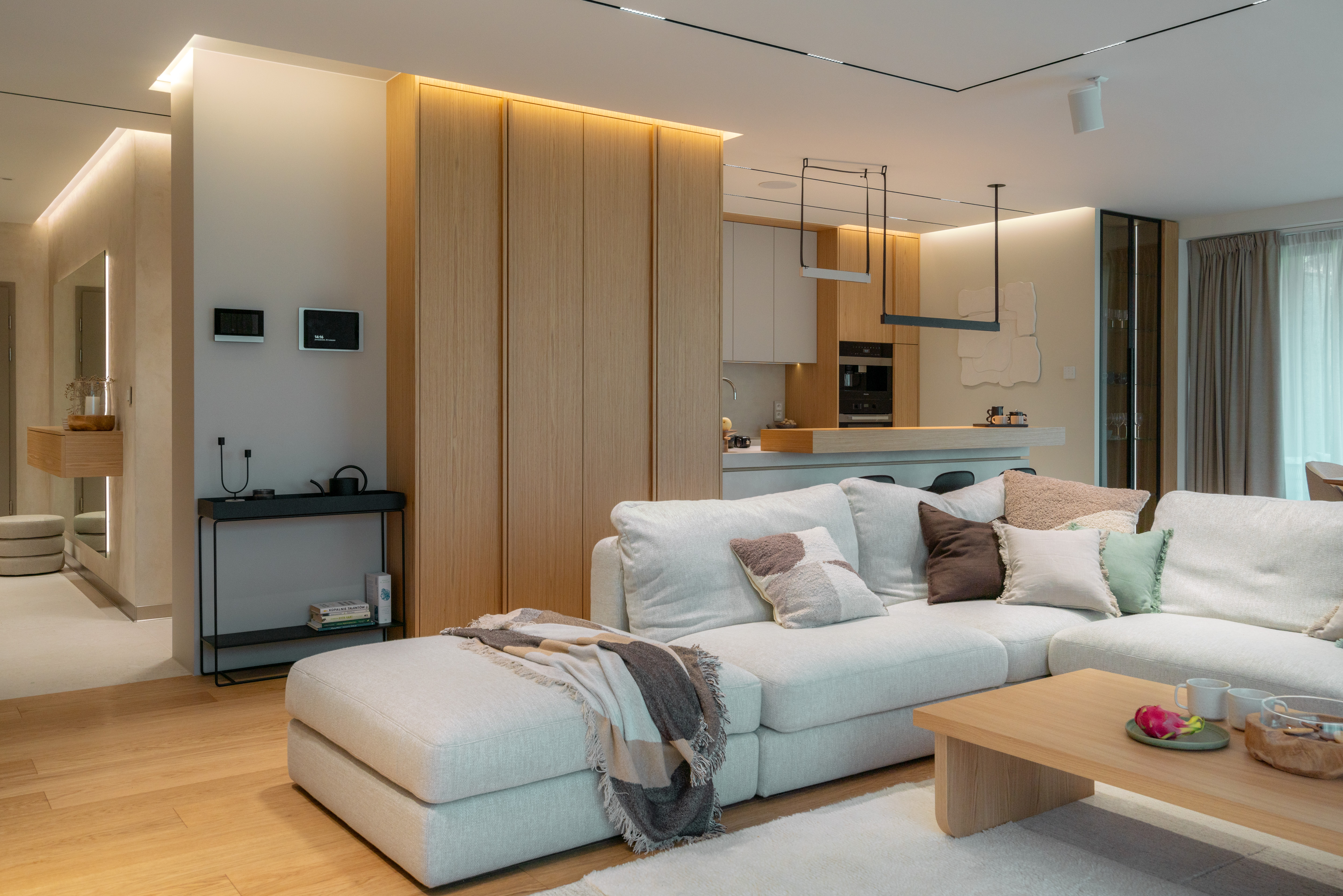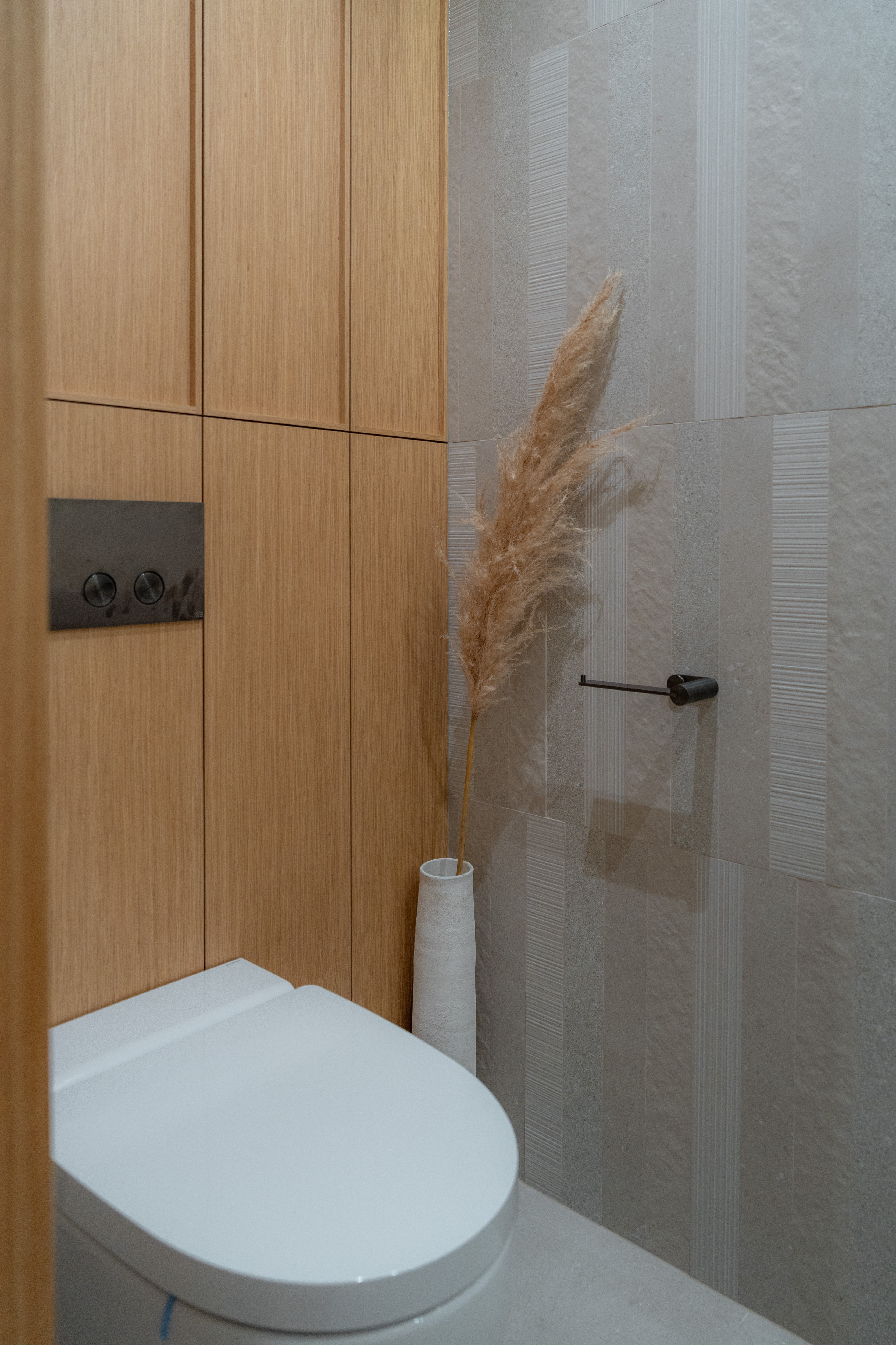 W tym domu w Krakowie dominującym motywem jest fornir naturalny o ciepłym wybarwieniu, zastosowany konsekwentnie w zabudowie meblowej w całym wnętrzu. Naturalna faktura drewna wnosi do domu przytulność i ponadczasowy charakter, jednocześnie tworząc spójne tło dla pozostałych materiałów.