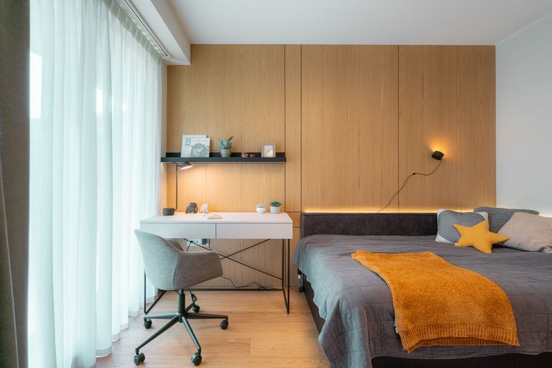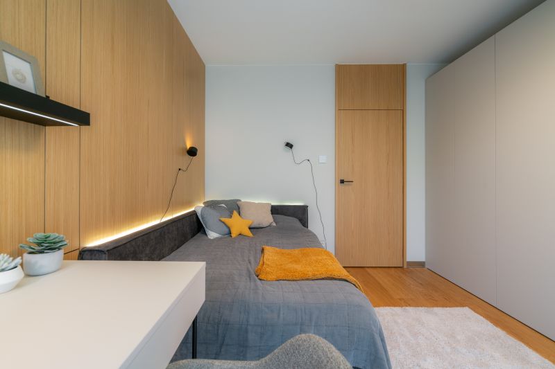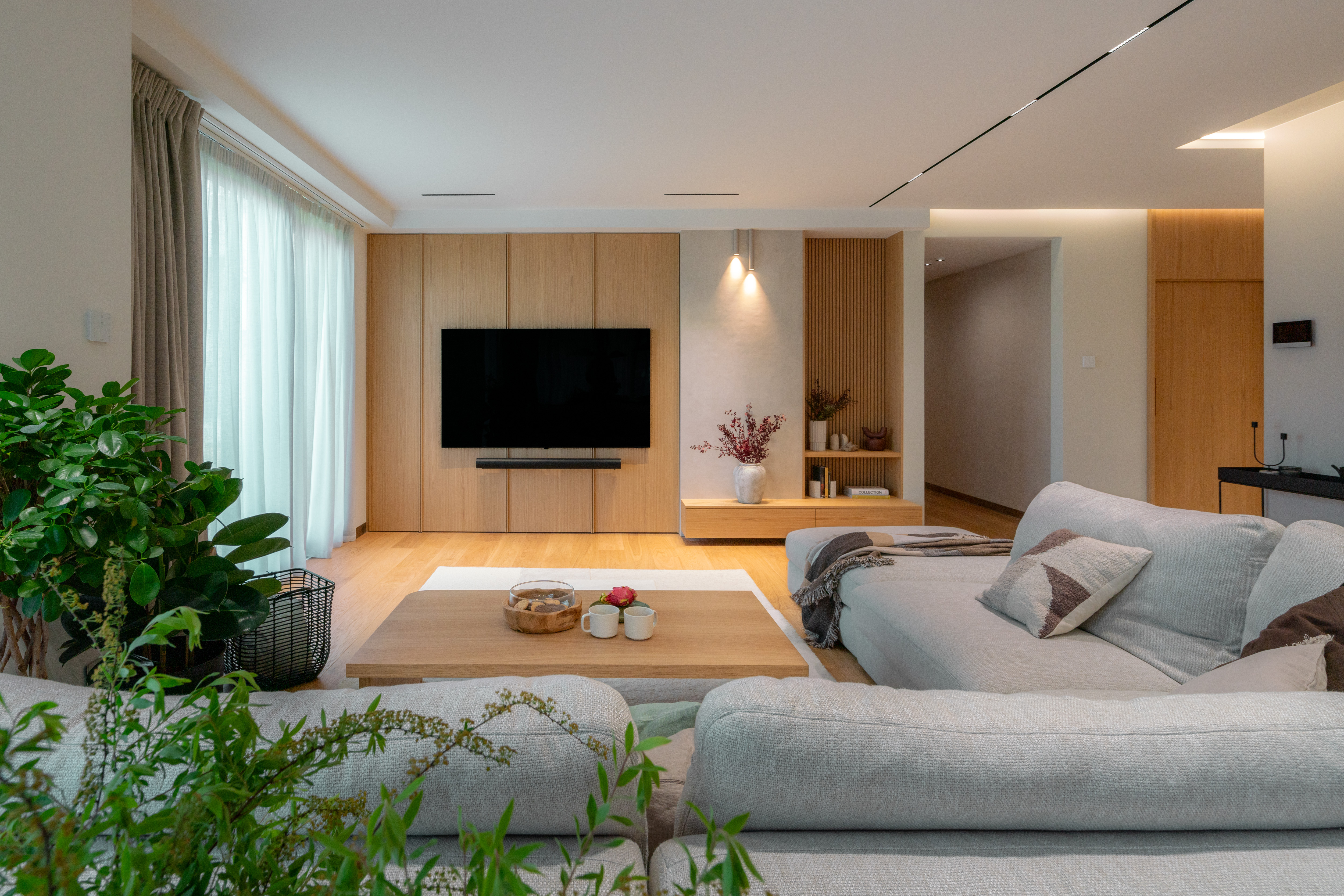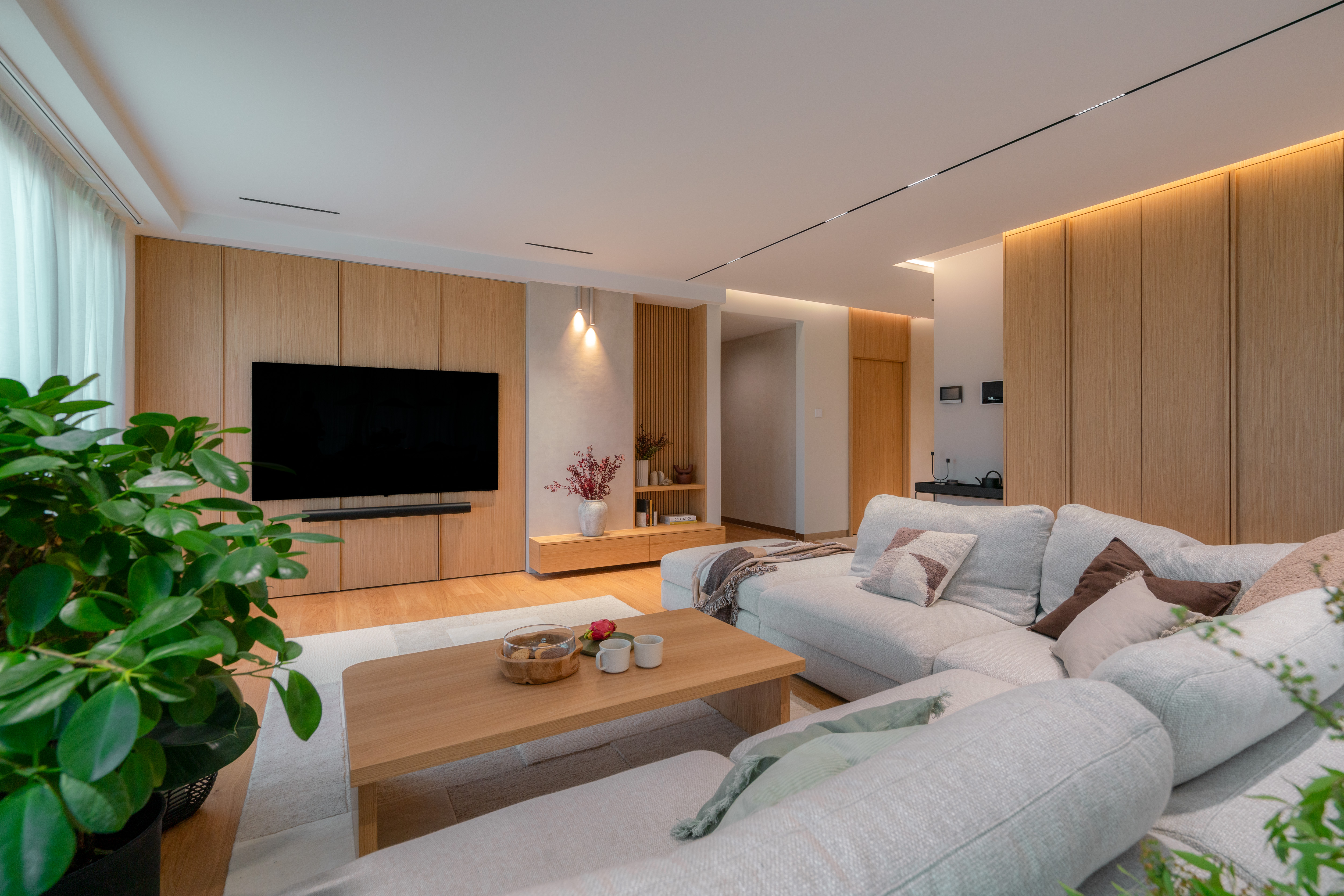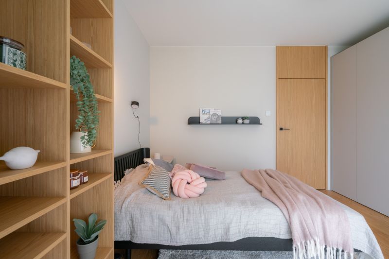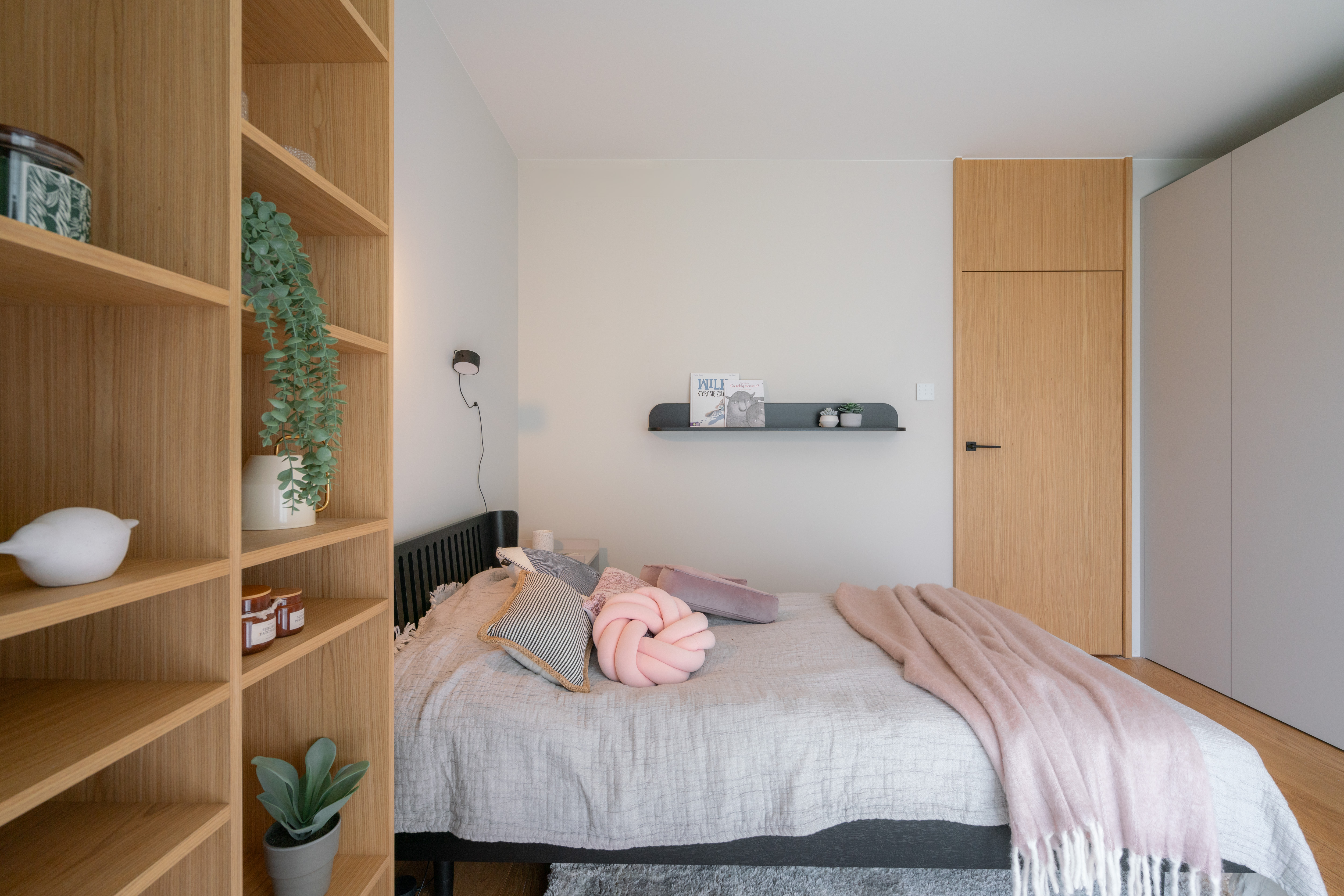 W tym domu w Krakowie dominującym motywem jest fornir naturalny o ciepłym wybarwieniu, zastosowany konsekwentnie w zabudowie meblowej w całym wnętrzu. Naturalna faktura drewna wnosi do domu przytulność i ponadczasowy charakter, jednocześnie tworząc spójne tło dla pozostałych materiałów.