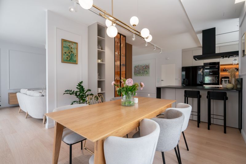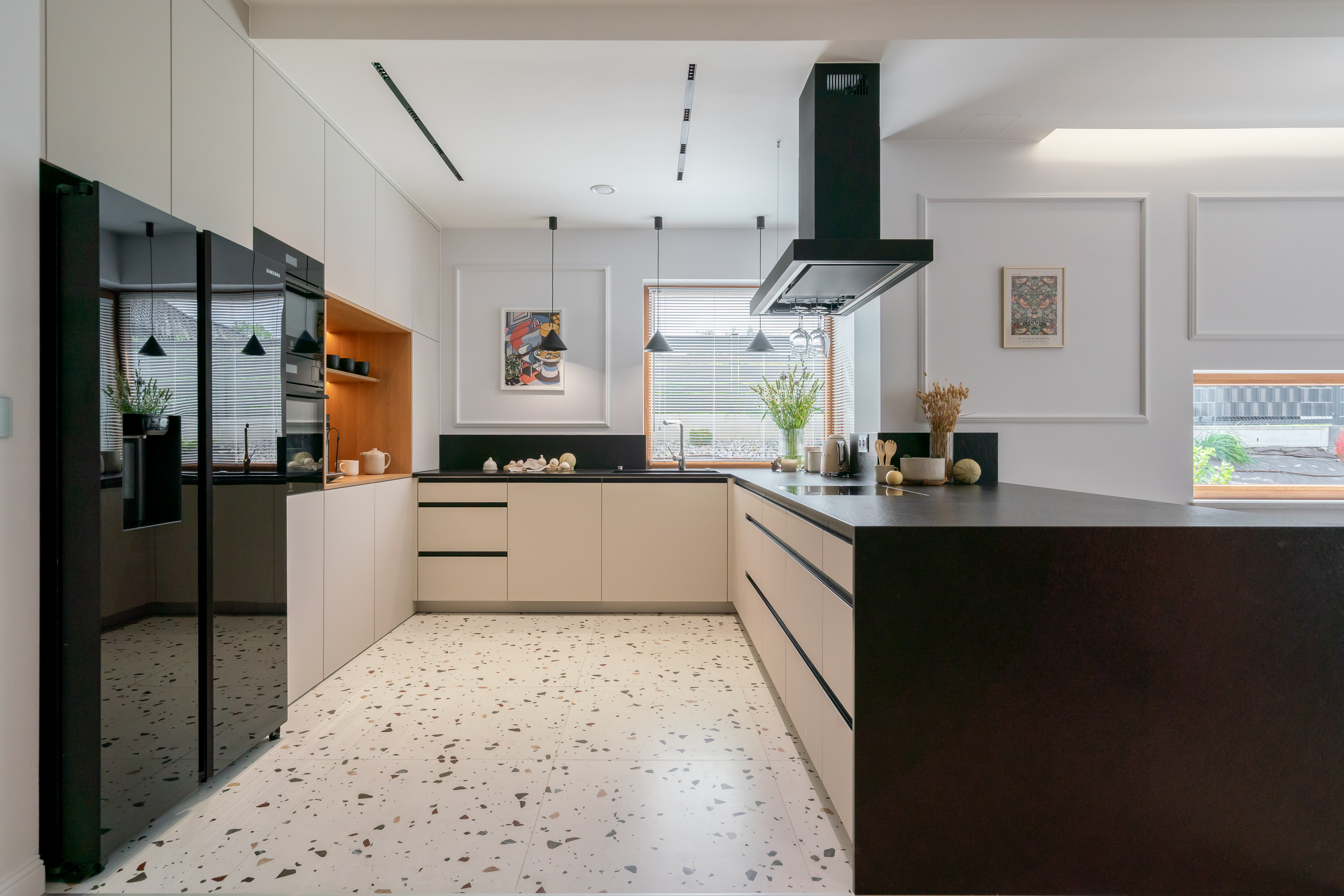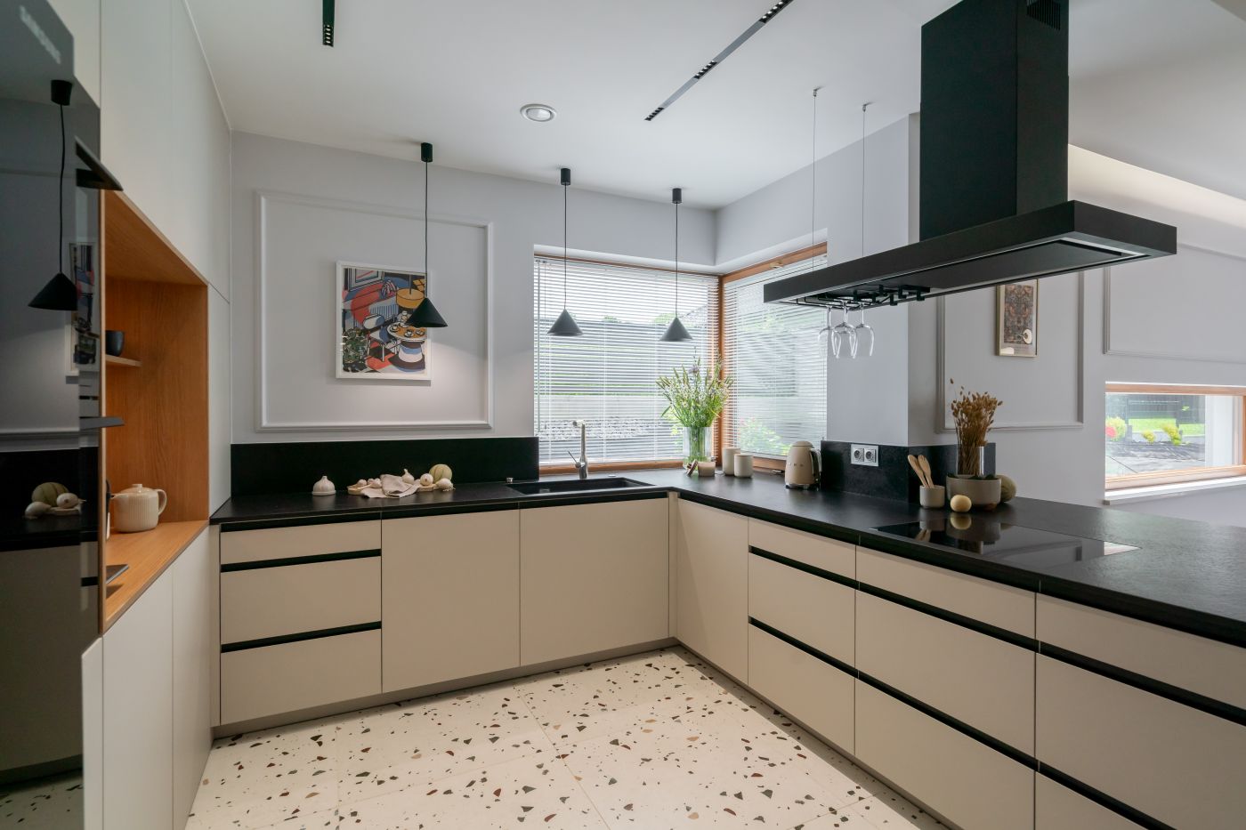 Kuchnia w domu w Skawinie łączy naturalne drewno z eleganckim blatem kamiennym wykończonym efektem wodospadu — materiał blatu kontynuuje się po bocznej krawędzi wyspy, tworząc spójną, nowoczesną bryłę. Ten zabieg nie tylko...