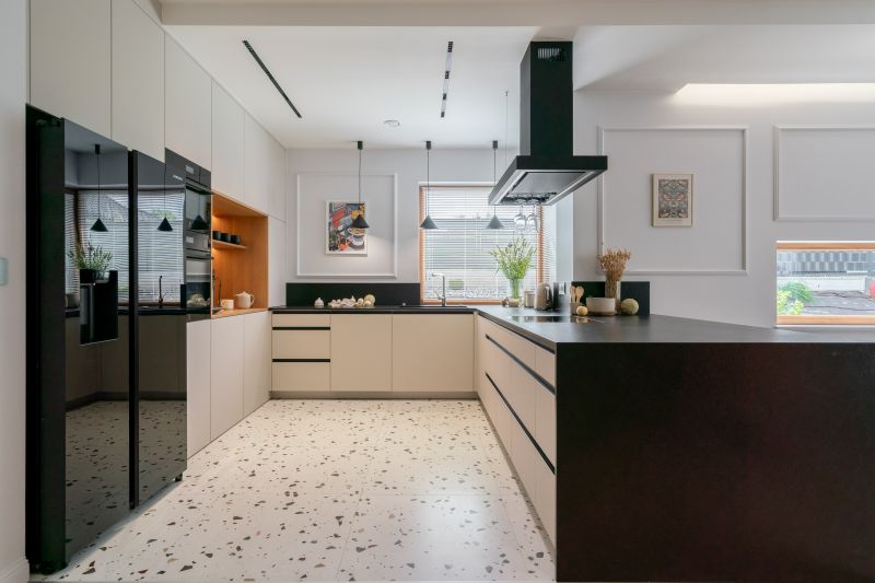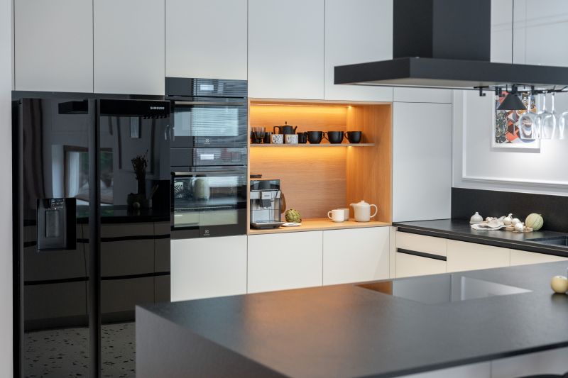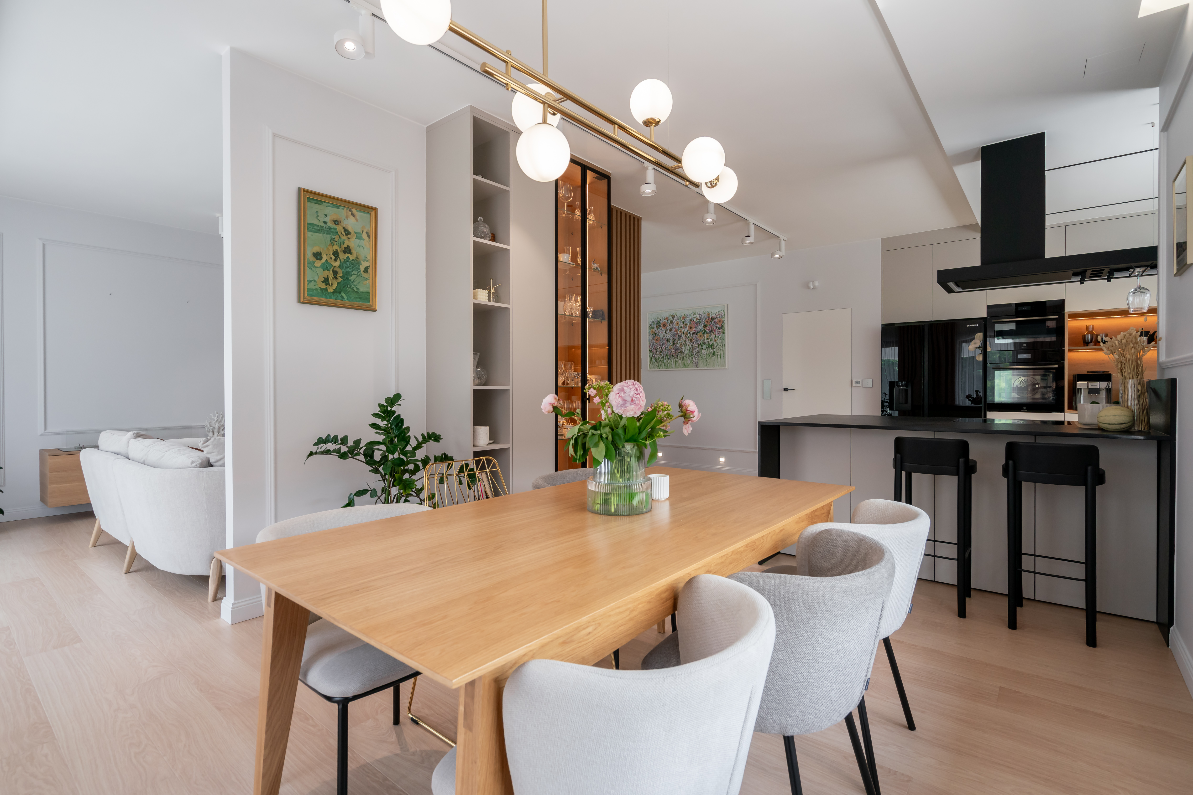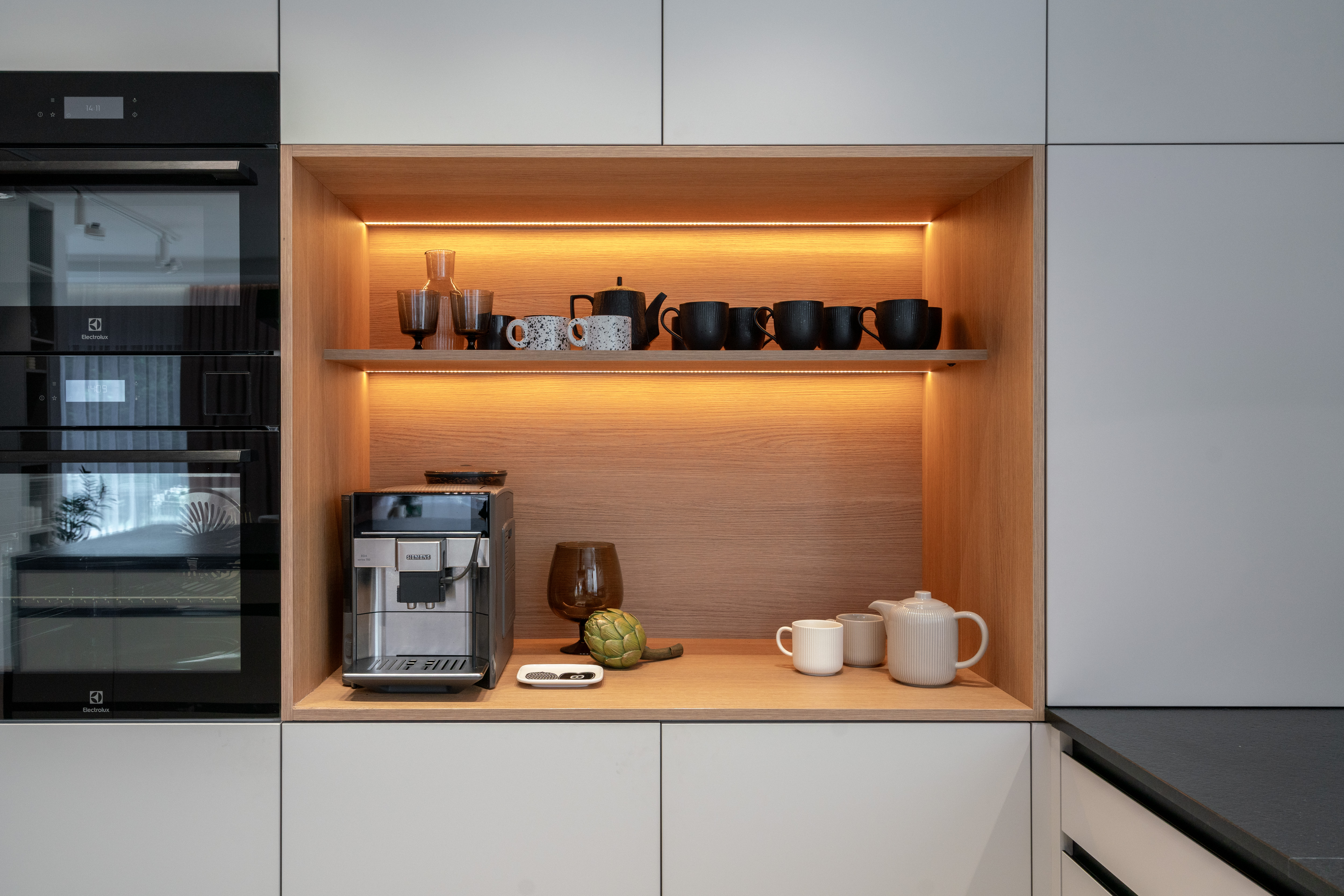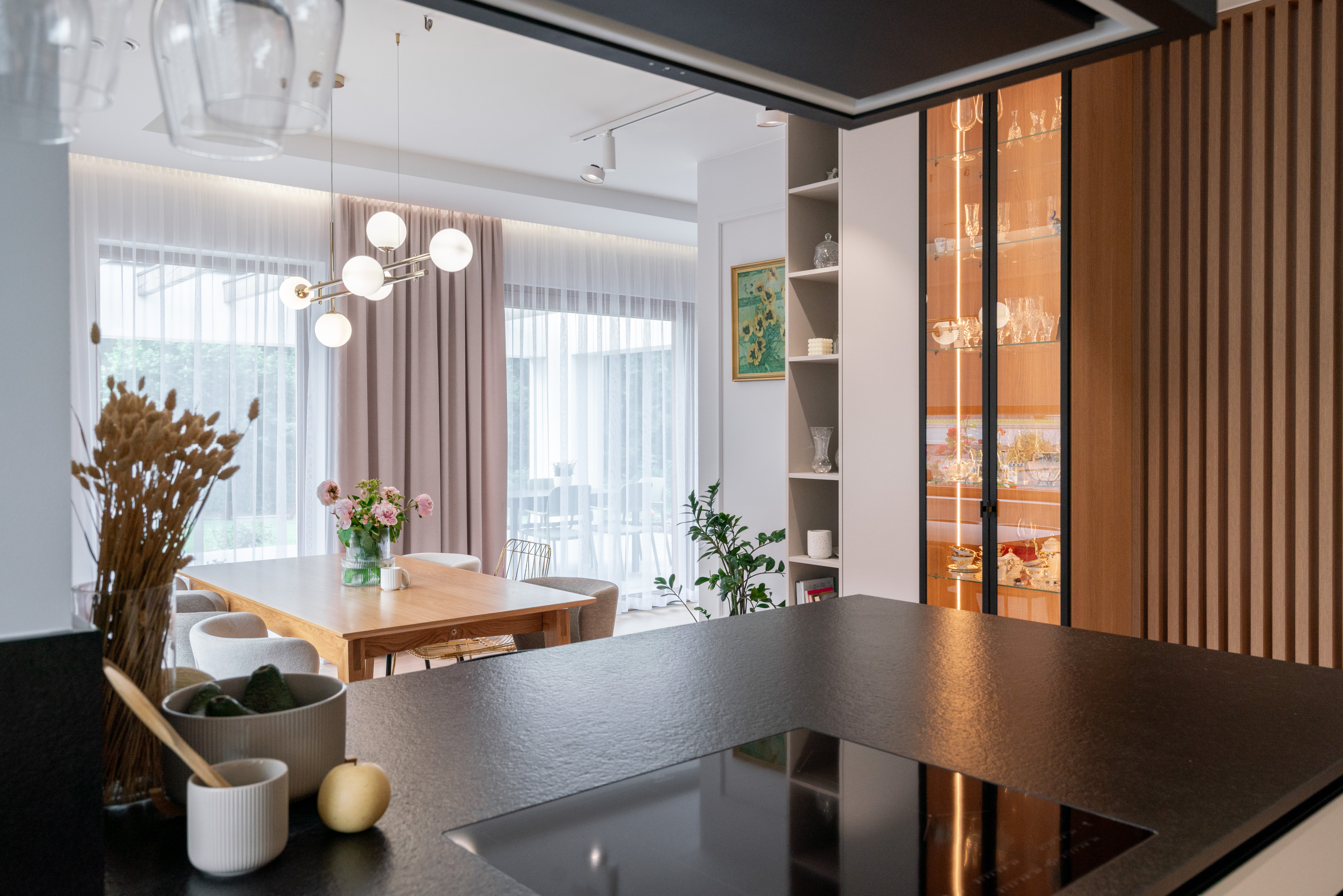 Strefy robocze zaprojektowano ergonomicznie: właściwa wysokość blatów, optymalne rozmieszczenie urządzeń AGD i praktyczne wysuwane kosze poprawiają komfort codziennego użytkowania. Subtelne, ciepłe oświetlenie LED nad blatem i we wnętrzu witryny podkreśla strukturę drewna i kamienia, tworząc przyjemną atmosferę rano i wieczorem.